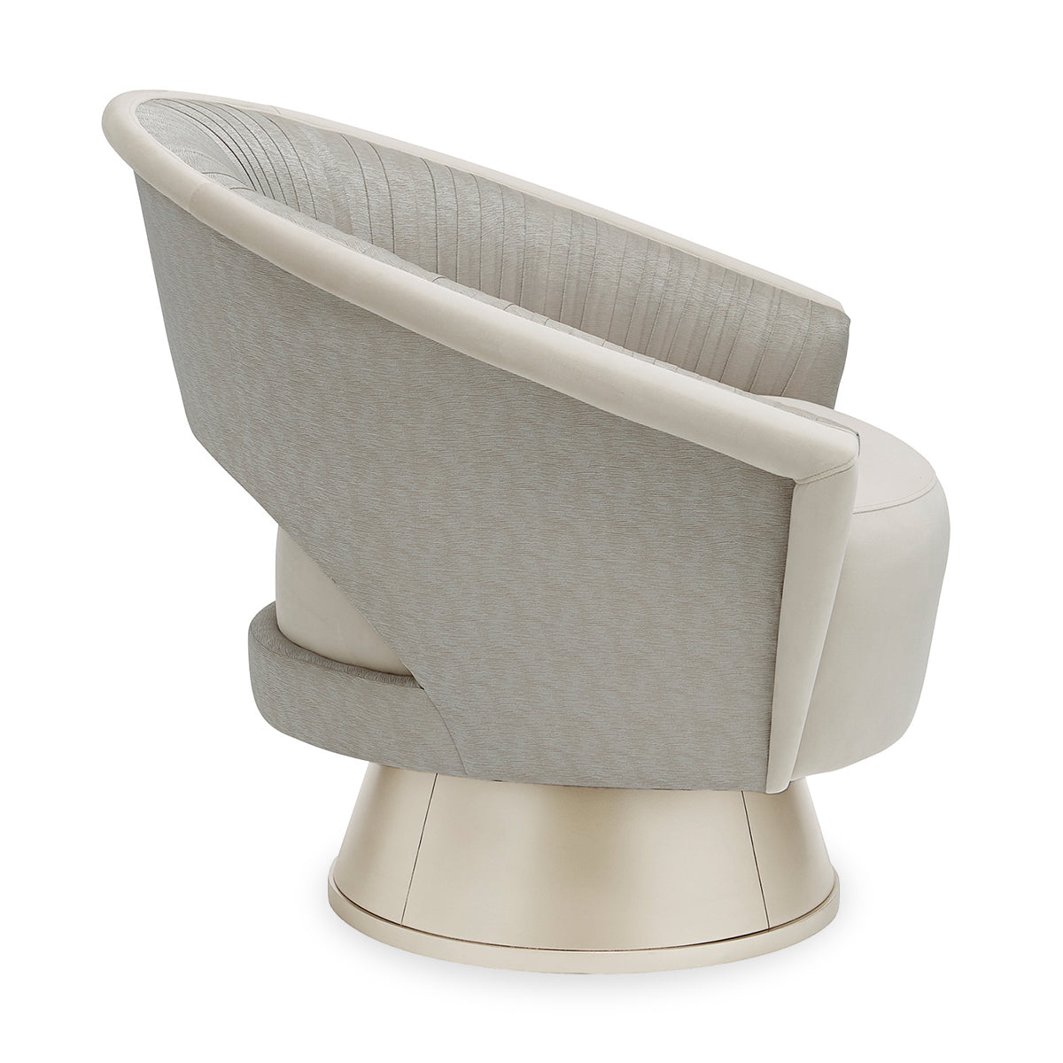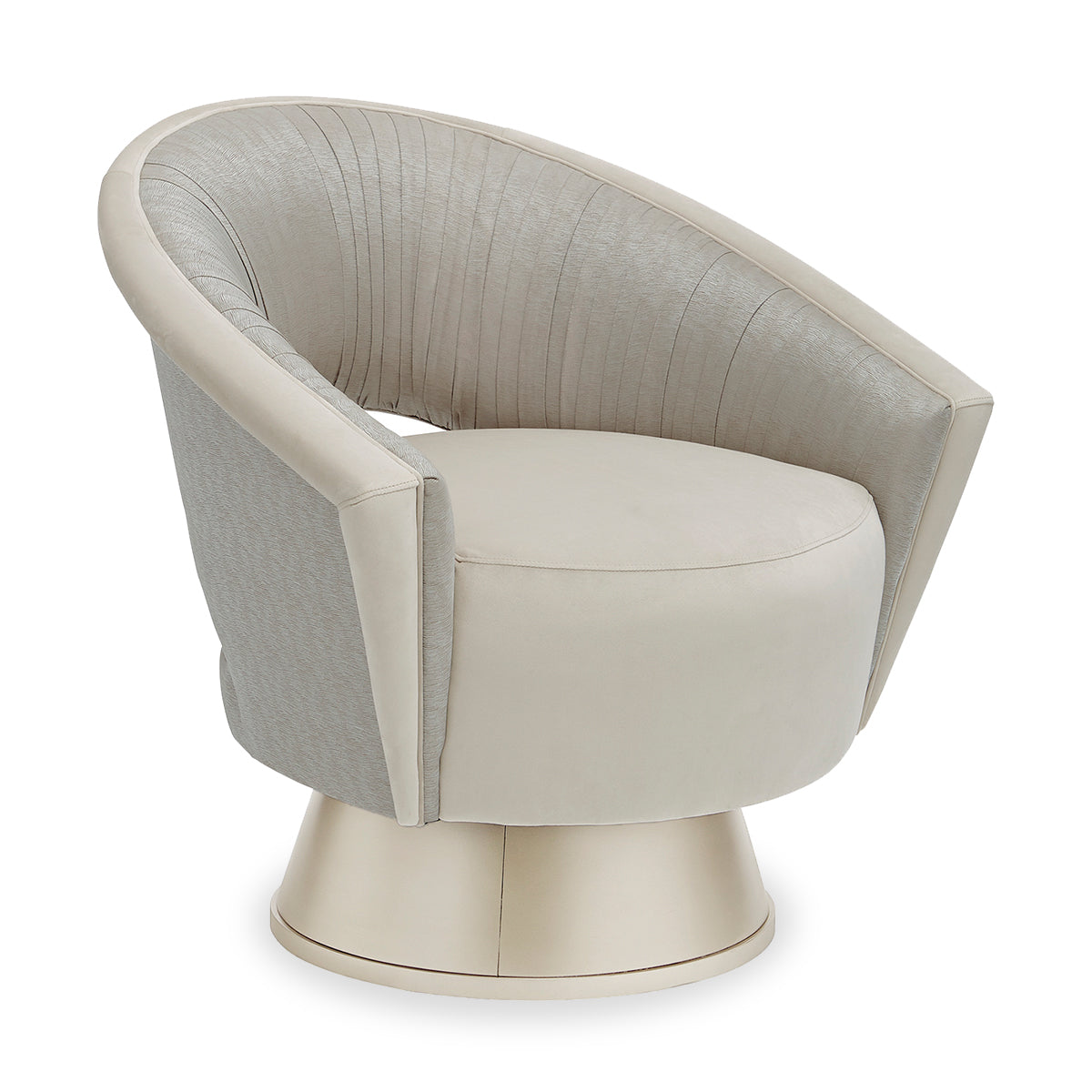 This chair features a unique tight pleating effect in Grey Satin fabric that exudes refined elegance. Its seat and top rail are covered in Soft Buff Velvet, and it has a fun and functional swivel base in Soft Silver Paint. Don't be surprised if this chair becomes the crowd's favourite.