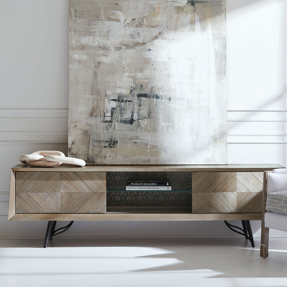 Get ready to get inspired! This divine console is destined to be the motivation behind the redecoration of many living spaces. Its clean and unfussy architectural shape is accented with exquisite wood veneers, including two sliding doors featuring diamond veneer patterns. Move either door aside to create a different front look as well as reveal an interior featuring a stunning pierced metal back panel finished in Sundance Gold and an interior glass shelf. An effortlessly elegant Ash Driftwood finish highlights its wood tones while its shapely metal legs wear a rich shade of Chocolate Bronze. When it comes to statement-making furniture design, this one is truly A Cut Above.