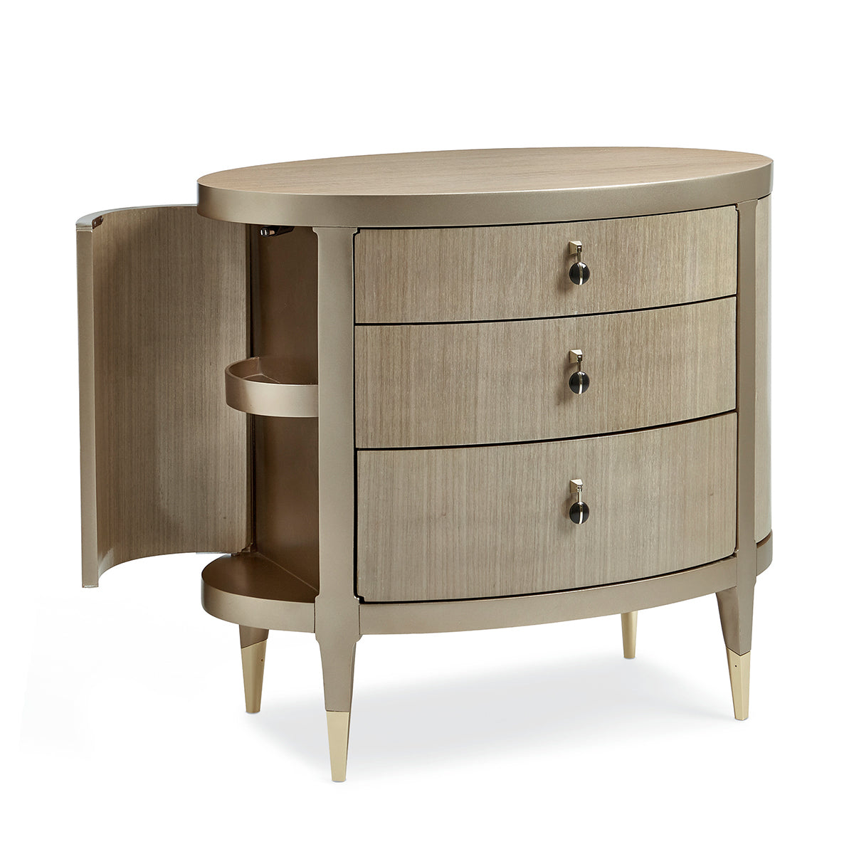 Perfection in every detail, this nightstand will elevate your bedside. It has an oval shape crafted in Koto Veneer with a Champagne Shimmer finish for a timeless appeal. Framed in a shimmering Taupe Paint finish complemented by tapered legs with Whisper of Gold metal ferrules, this piece has a robust appearance. On the storage front, it carries three drawers with doors on the end panels having spacious shelves.