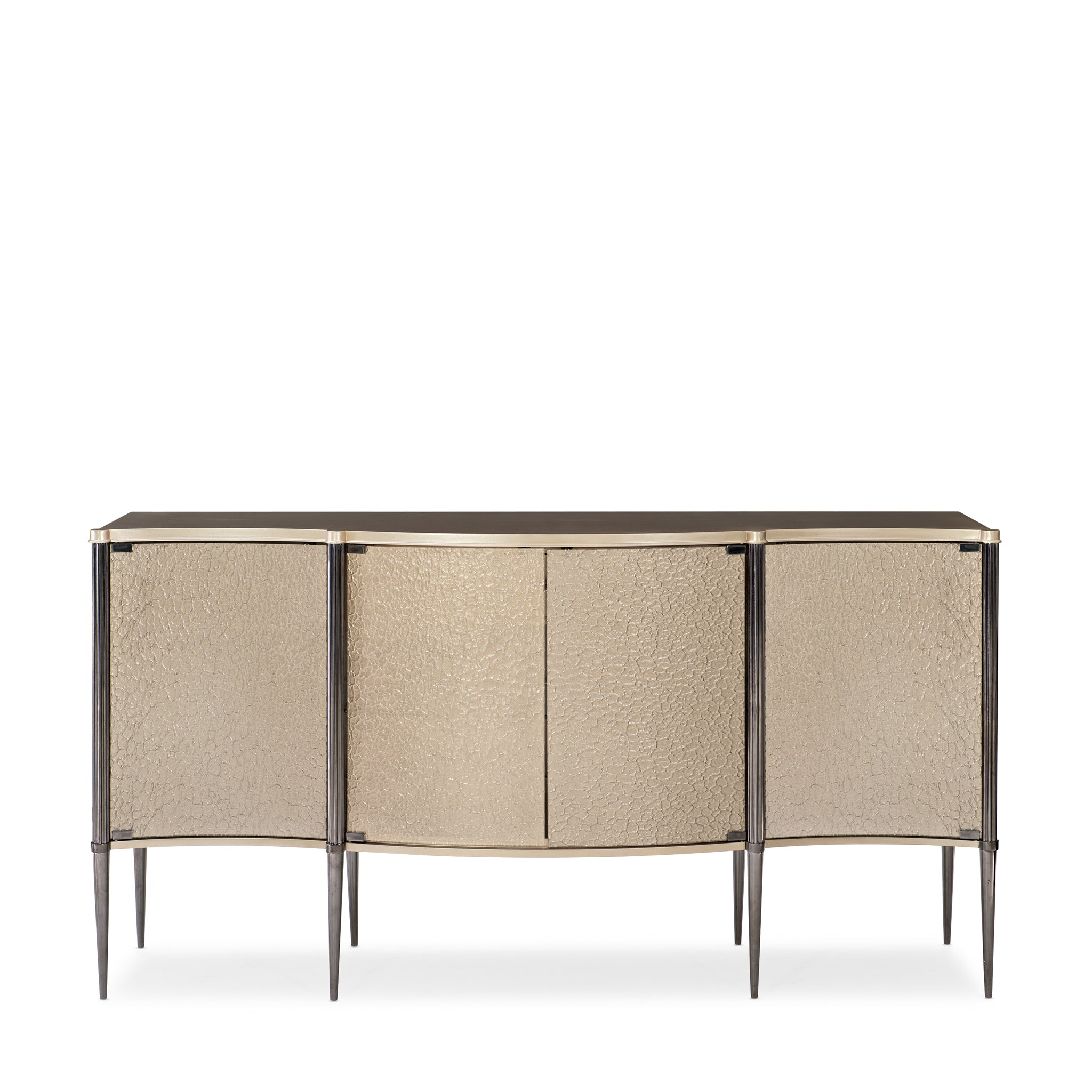 Give your room endless character by incorporating this shapely, shimmering cabinet in your design plan. Serpentine in shape, it boasts an intriguing mix of materials and features extraordinary curved glass doors crafted with a textured pattern on the inside. Metal posts and hardware finished in plated Deep Bronze add contrast to its Taupe Paint and Soft Silver Paint exterior. Ideal in the dining room or living room, this stunning design casts a warm metallic glow when bathed in light.