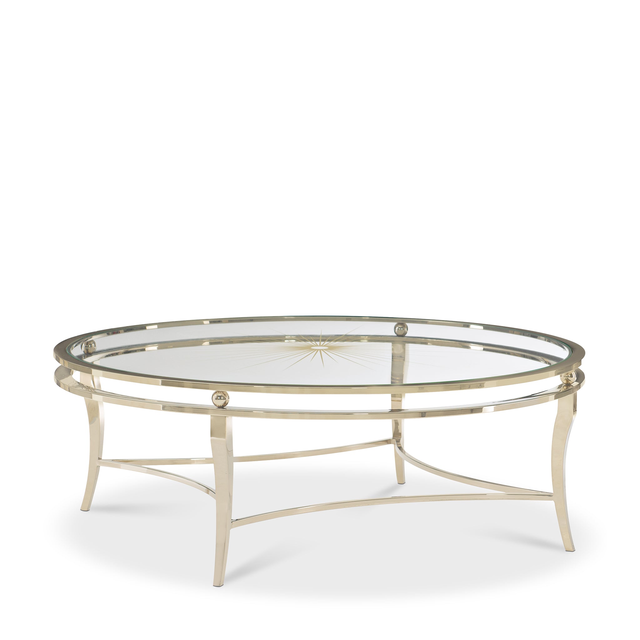 A Star is Born cocktail table exudes refined elegance, standing gracefully on its sleek metal frame with a stretcher in a Whisper of Gold. Clear tempered glass silkscreened with an alluring starburst pattern in the center is accented with Neutral Metallic for a classy touch. This piece is adaptable to a variety of interior design styles.