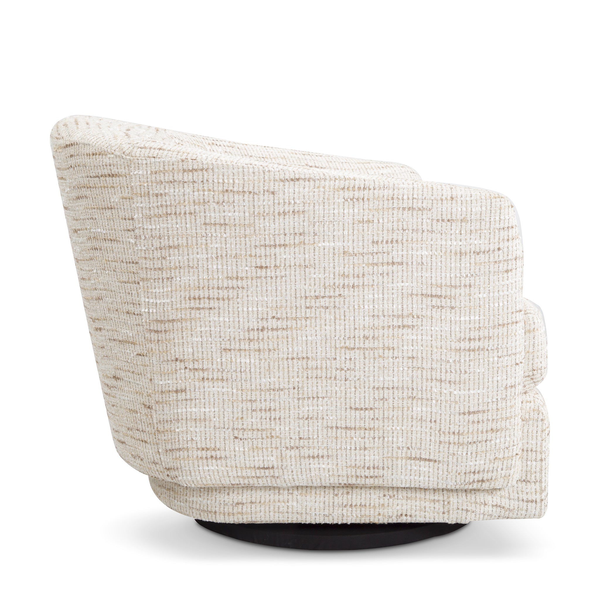 Sit, spin, and engage yourself in spontaneous conversations with the Adrian Swivel Chair V. It's a curvy composition wrapped in Chenille fabric with tones of Beige and Brown for a visually attractive aesthetic. The round-shaped base is clad in Black Linen, which complements the pastel color scheme of the chair perfectly.