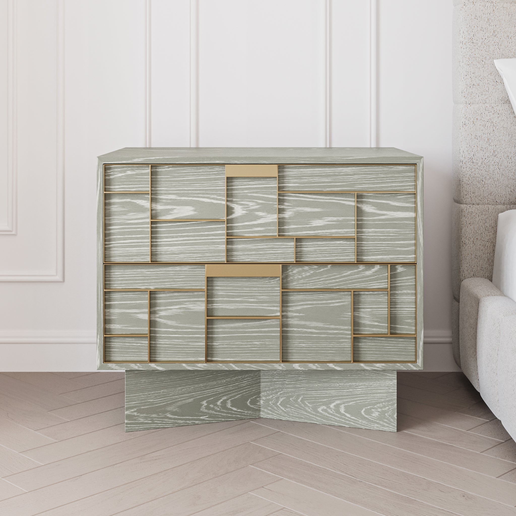 The Art-Deco-inspired nightstand will undoubtedly be the center of attraction in your bedroom. The box-shaped form in the Beige Oak Veneer finish illuminates the natural beauty of the wood grains. It is accentuated with geometrical patterns in a Brushed Brass Stainless Steel finish on the drawer fronts. Knobs are finished in the same. The Concave-shaped base in a Beige Oak Veneer finish adds to the aesthetics.