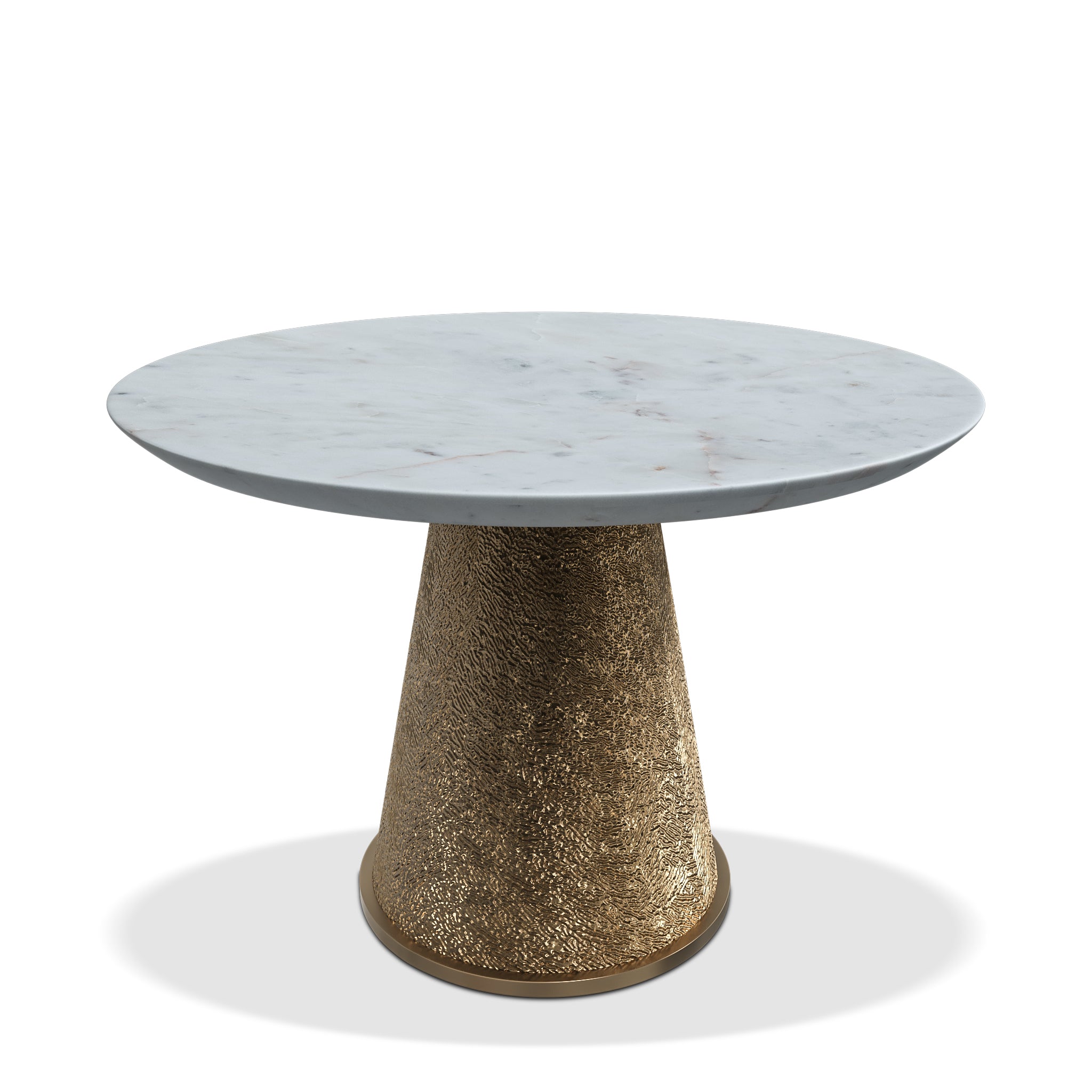 Give your dining space the desired aesthetics it deserves with the Andaman Medio Round Dining Table. The exquisite mix of White Banswara Marble top and hand-hammered textured base in a Burnished Brass finish makes it a conversation starter. Also, the colors visually complement each other well.