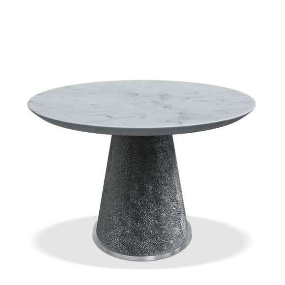 Give your dining space the desired aesthetics it deserves with the Andaman Medio Round Dining Table. The exquisite mix of White Banswara Marble top and hand-hammered textured base in an Antique Silver finish makes it a conversation starter. Also, the colors visually complement each other well.
