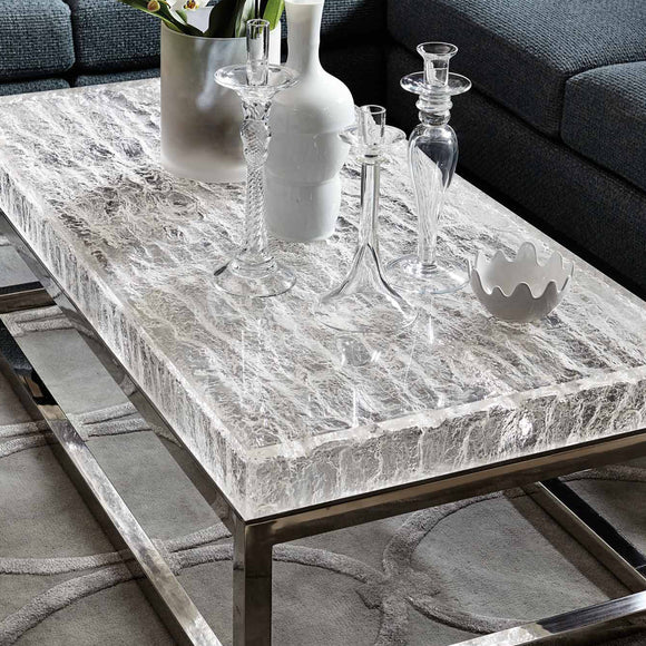 Bring this cocktail table to your place to add fun and convenience to the parties. The polished base and stretcher cast of stainless steel provide adequate support. The Solid Acrylic top is complemented with a cast wood grain pattern.