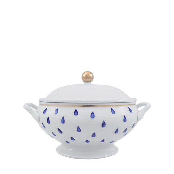 A splendid piece of designer bowl to serve soup on the dinner table. Its ethereal white body adorned with droplet-shaped elements in blue adds a charming character to the dining setup. The Golden rim and highlight on the lid handle compliment the overall look perfectly.