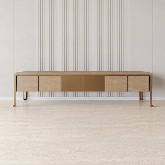 Transform your space to the next level of sophistication by incorporating this versatile TV media cabinet. It flaunts a rectangular wooden form in Greige Oak Wood Veneer finish that carries six storages with a Brushed Brass accent on two center drawers to increase visual interest. Braced by a Stainless Steel base bathed in Brushed Brass finish, this piece radiates a gleaming appearance. Elevate your entertainment collection with this minimalist yet fancy item.