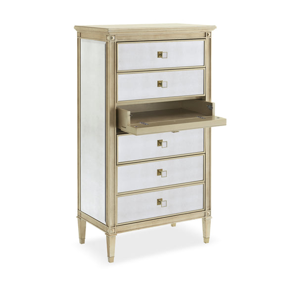 This drawer will make you fall in love all over again with its classic design that includes five soft-close drawers. The Auric Silver Leaf finish and stunning beveled antique mirror surfaces highlight its silhouette. Elegantly carved square, tapered feet with metal ferrules elevate this piece to the next level of grandeur.