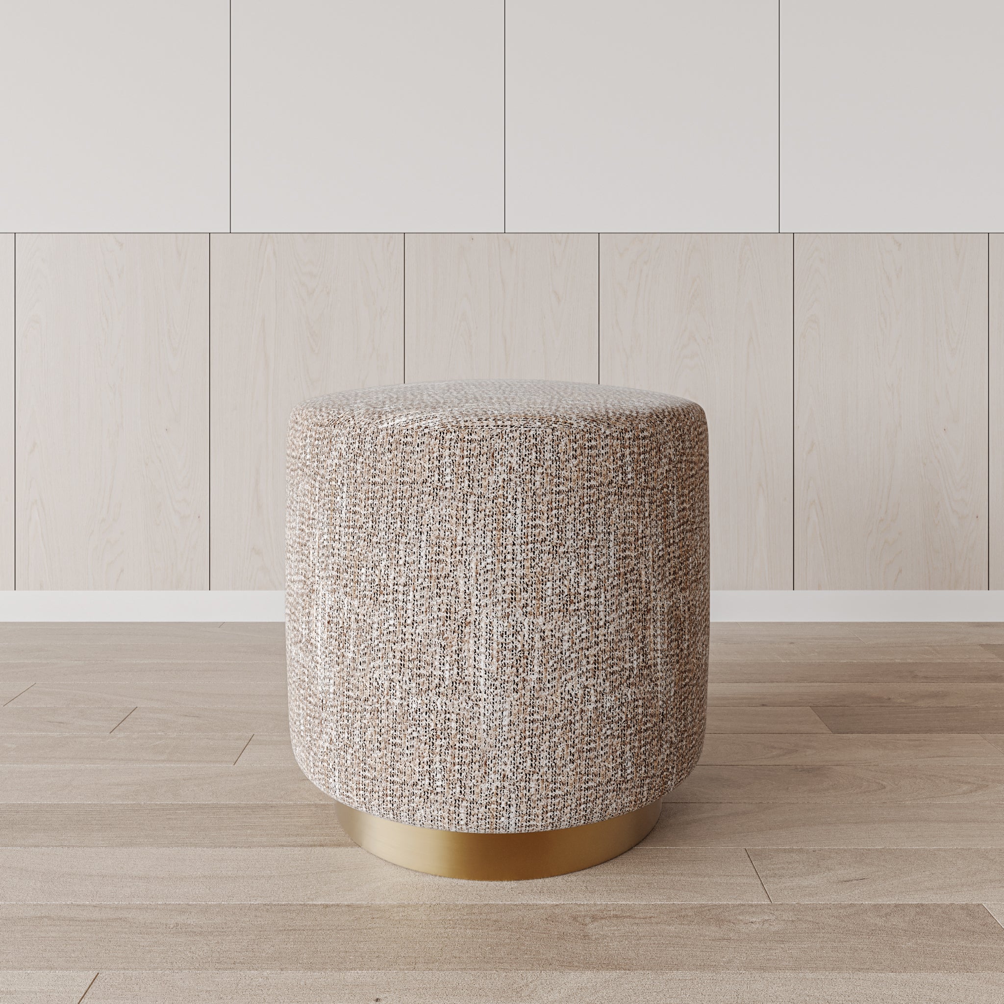 This chic ottoman is your answer to the perfectly combined living room visuals. Boasting a cylindrical form, it is dolled up in Chenille fabric with Beige and Black weaving and sits on an Electroplated Brushed Brass base to keep it slightly elevated from the ground. This piece conveys an on-trend style that easily fits any setting.