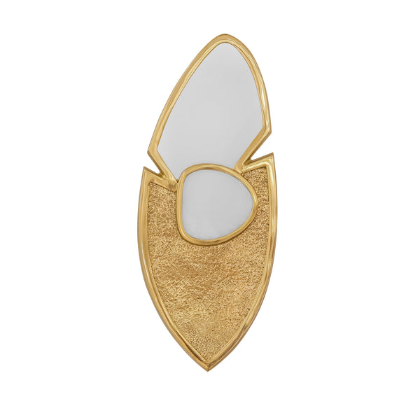 Minimalist is the perfect definition for the Canary Wall Sconce. Polished in Brass, the shield-shaped backplate has a sleek designer pattern at the top, both donning a golden visage. It is accentuated with organically shaped White Alabaster stone in a Brass frame. Pair it with a contemporary nightstand beneath to complete the interior setting.