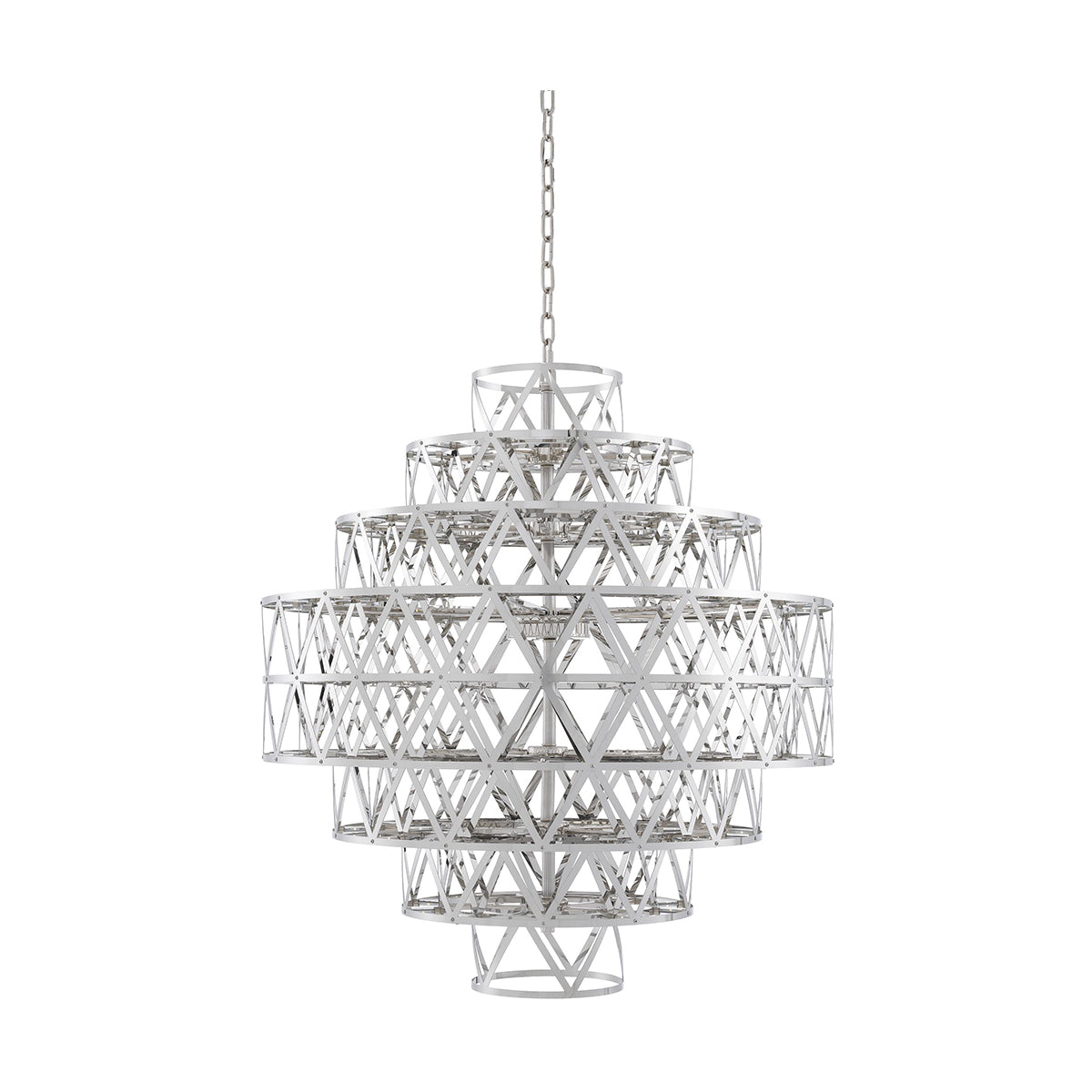 With the Clinton Chandelier, you can bring a modern twist to the traditional design. Its geometrical frame is crafted in steel and connects 160 LED lights to create a spectacular illumination. This piece features a striking design in a Nickel finish that stands out in a contemporary living room setting.