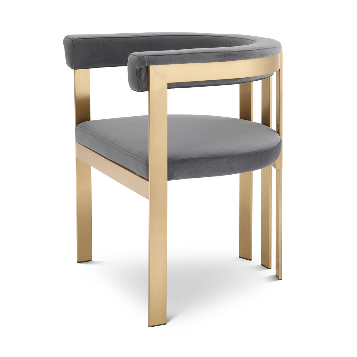 Decorate your dining area in contemporary style with the Clubhouse Dining Chair. This ultra-chic chair features a stylish frame in a brushed brass finish with a backrest that blends seamlessly into the armrests. The comfortable seat and backrest are upholstered in Savona grey velvet, and allow your guests to enjoy seating for long periods at a time.