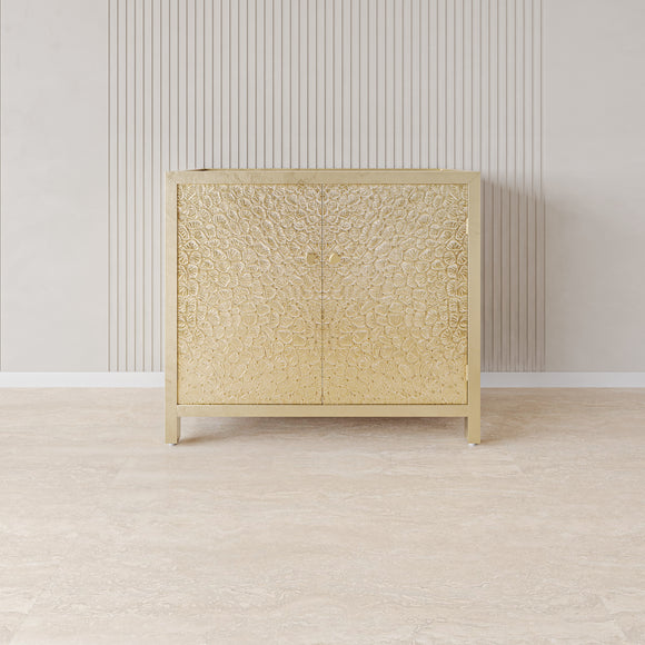 This classic piece in your living room will brighten your space and create a standout appeal. The sturdy wooden form with a Brass finish shines in an organic pattern, creating an impressive aesthetic. Two soft-close doors with decorative knobs conceal one shelf for stylishly keeping your belongings, and the Brass accent on the legs rounds out the design.