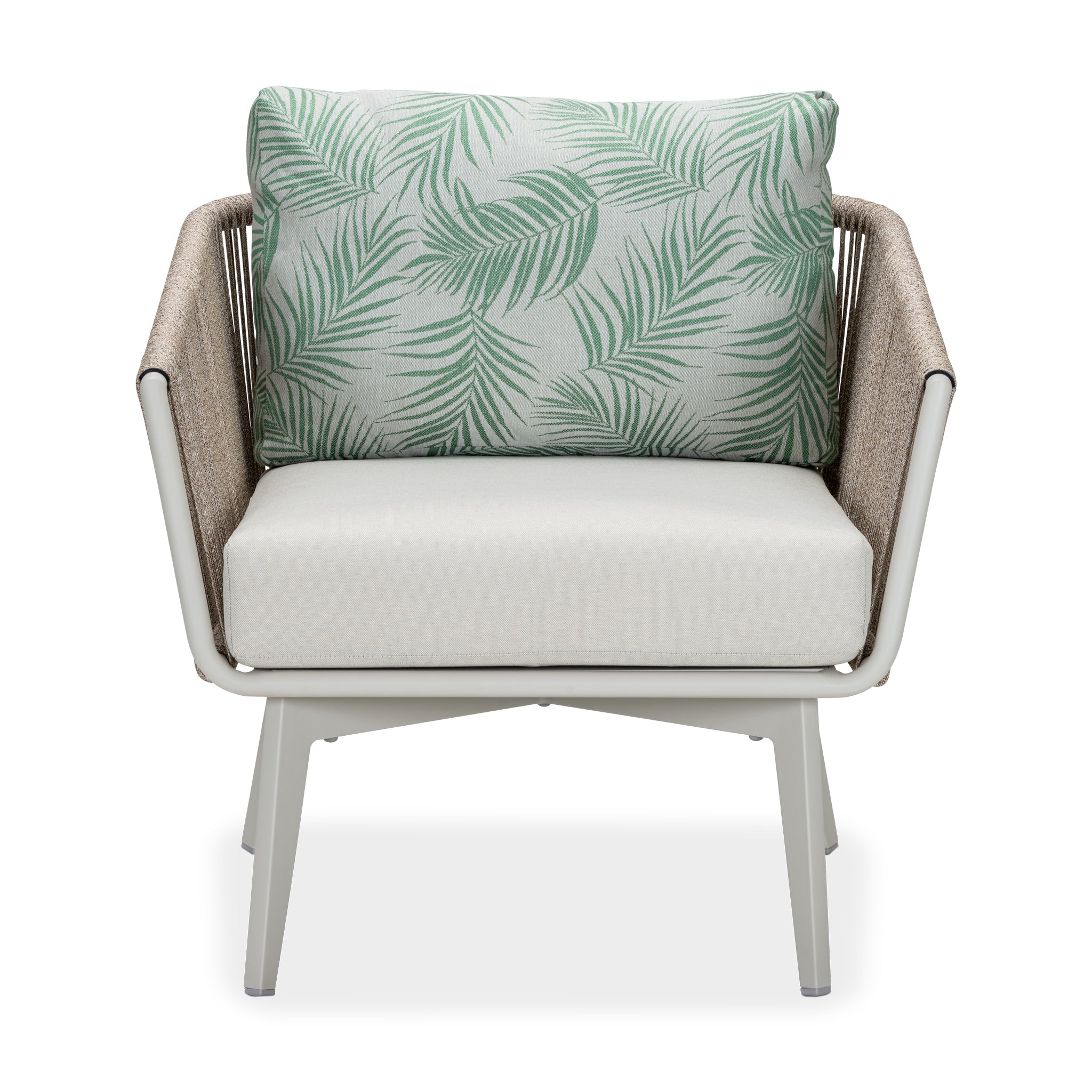 This simple yet attractive Diva Latte Armchair is upholstered with the back cushion in Palm Verde and the sitting cushion in Beige Pecan outdoor fabrics.