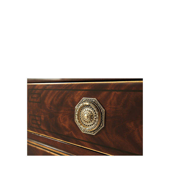 Rich in complexity and style, the Donwell Buffet is a must-have for flaunting an impressive decor scheme. Clad in Flame Figured Veneer and Yew Burl Veneered bands, the unit has ample storage space in the form of drawers and shelves. The bowfront top adorned with Ebony and Brass inlaid edge creates indulgence, while the tapering columns suggest a study structure.