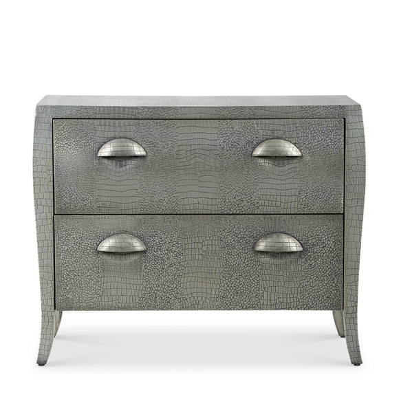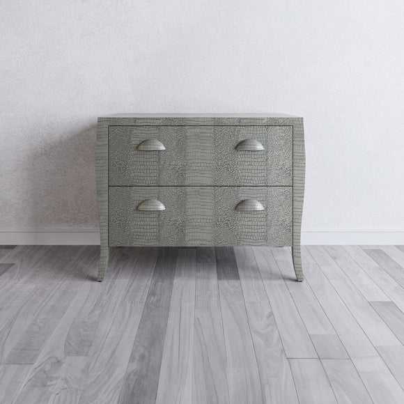 The showstopping dresser will surely be the center of attention in your bedroom—a robust wood composition cladded with White Metal boasting a striking crocodile pattern. Curved handles add an enticing dimension to the two deep drawers. The Dreamer Dresser is held up by four saber legs decorated in the same texture for a seamless configuration.