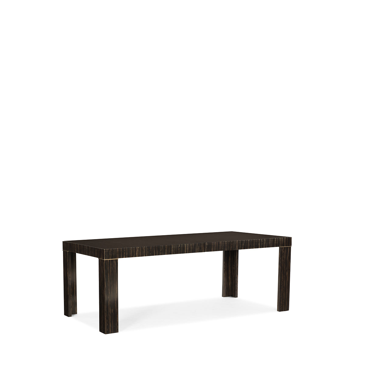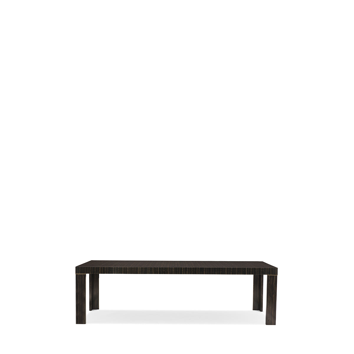 Spacious and elegant, this dining table features a rectangular-shaped top that is inspired by the timeless parson table. Striated Ebony with Lucent Bronze Metallic Paint trim brings striking personality to the tabletop and legs. This piece will make every meal special.