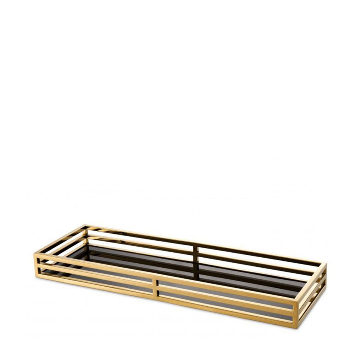 The functional and elegant Ersa Tray will add a touch of glamour to your living space or the dresser. The sleek metal frames in Gold finish flaunt smooth and clean lines while a rectangular Black glass base lends a luxurious touch. This piece is lightweight and portable, allowing you to serve in style or use it as a trinket tray.
