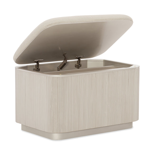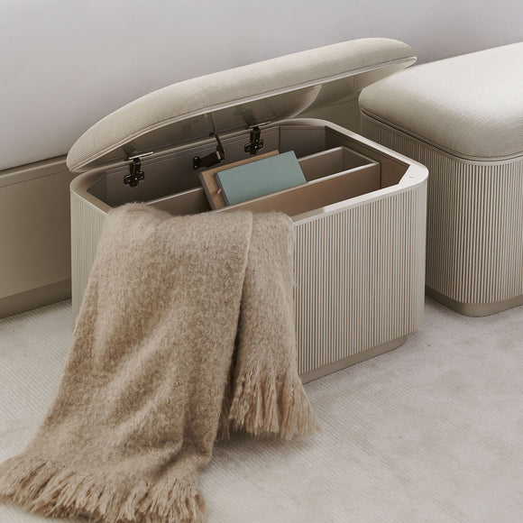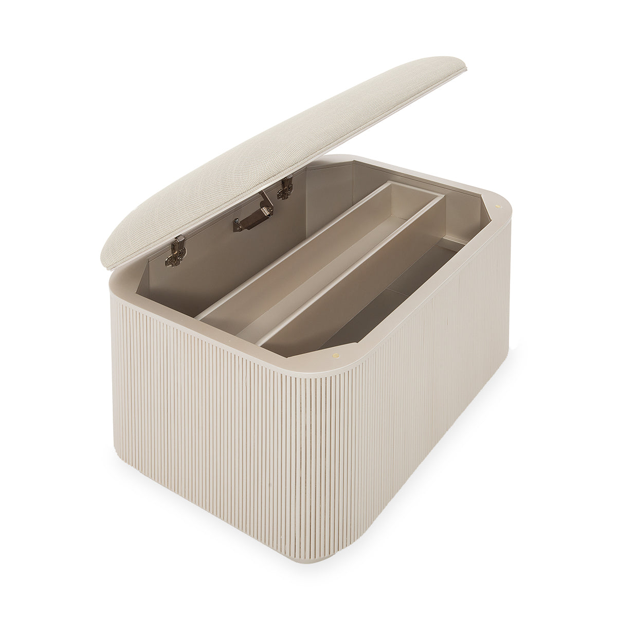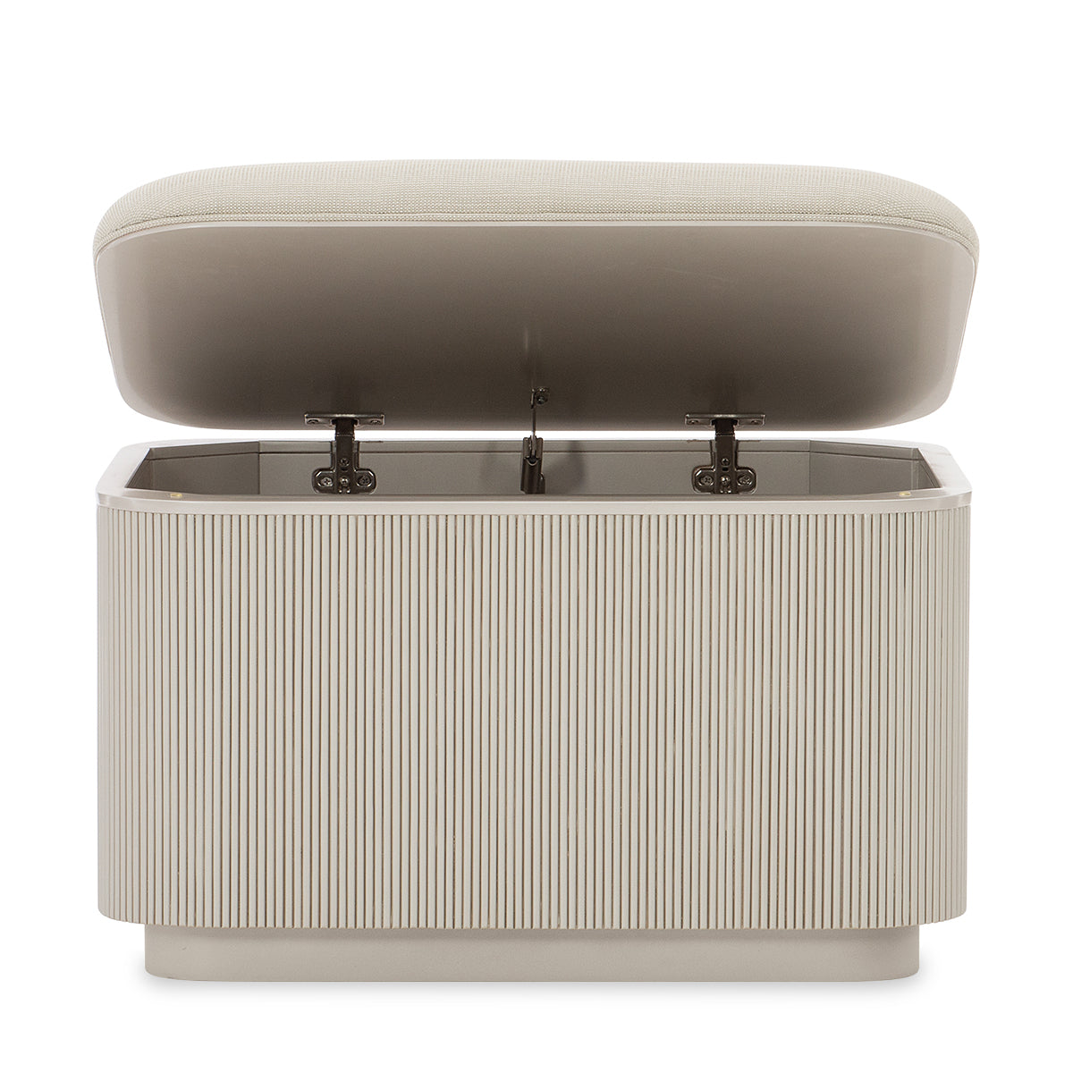 Storage has never felt so fashionable than with this luxe storage ottoman. Its lovely fluted exterior is highlighted in a Matte Pearl finish that will complement any room's decor scheme while a recessed base adds an element of distinction. Upholstered in a sophisticated neutral fabric, its top seat cushion opens to reveal multi-level storage. Boasting form and function, it's hard to say which is more valuable. Use it on its own or as a pair in nearly any room for a touch of signature style.