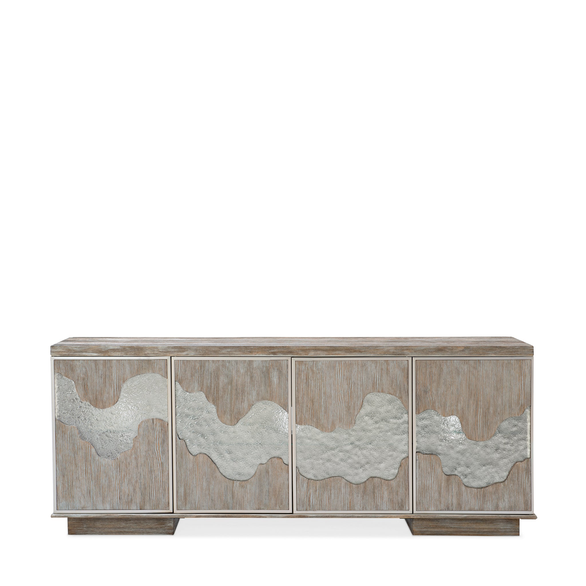 A beautiful representation of land and sea on the front dimensions of the sideboard makes it a one-of-a-kind piece. Adding effervescence to the modern decors is its unexpected mix of materials and motifs. The four touch-latch doors are crafted in wood veneers in Driftwood finish. Custom-cut glass panels create a soft, frosty effect as they are lightly shaded from behind. A lighted interior illuminating in Neutral Metallic finish paints it all goldeny.