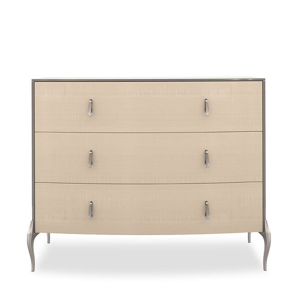 Flowing lines and soft, silvery paint make an elegant first impression with this three-drawer nightstand. Introducing a fresh perspective on light wood finishes, drawer fronts in Vanilla Cream bring to light the decorative character of figured sycamore. Elongated drawer pulls, inspired by an Art Deco jewelry pendant with a faux stone center, add a touch of grace. Ornate metal legs balance the subtly curved top and case, creating cool shimmer in Soft Silver Paint.
