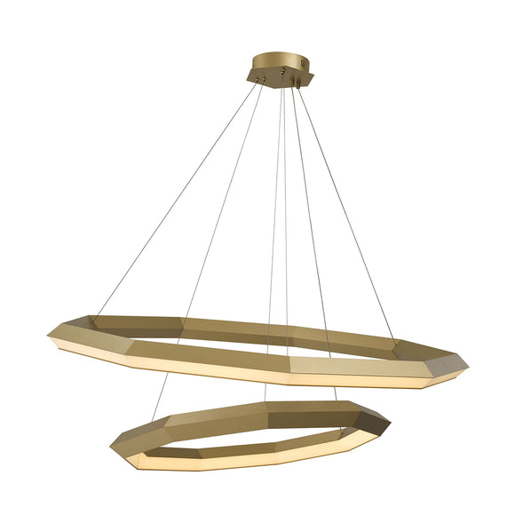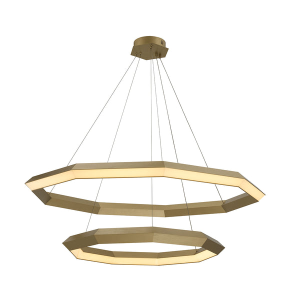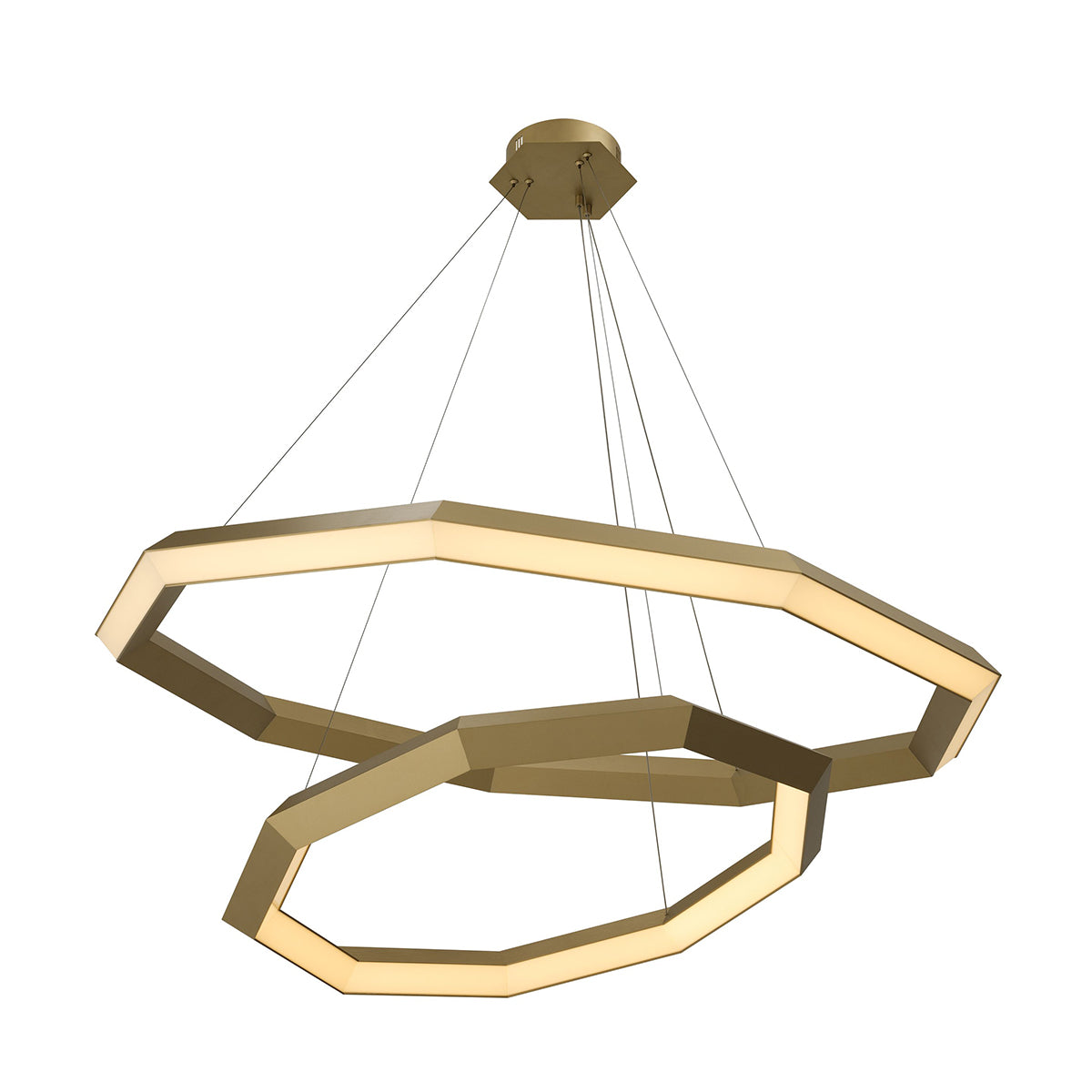 The enticing Helvetia Chandelier consists of two metal nine-sided polygons with integrated LED lights that form an ultra-stylish lampshade. Featuring an antique brass finish, the upper nonagon of this extraordinary luminaire shines outwards and the lower one shines inwards. Both light sources ensure pleasant, bright light and thus create a vivid atmosphere in the room. Due to the fastening with thin steel cables, the fixture almost seems to float. The polygons can be hung in any desired position by adjusting the length of the cables.