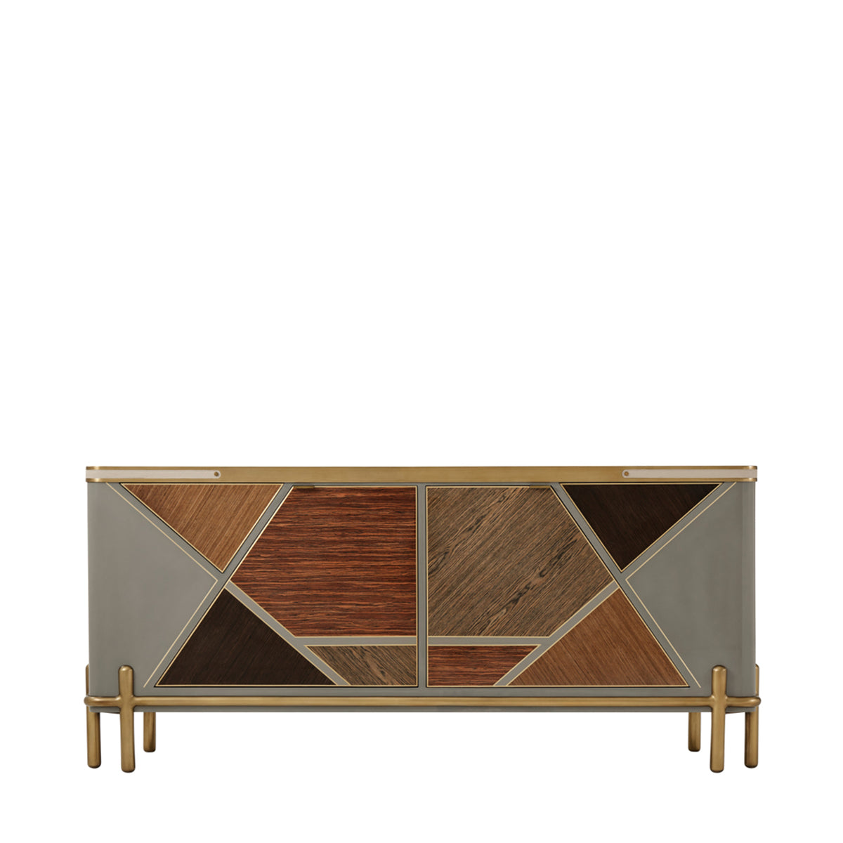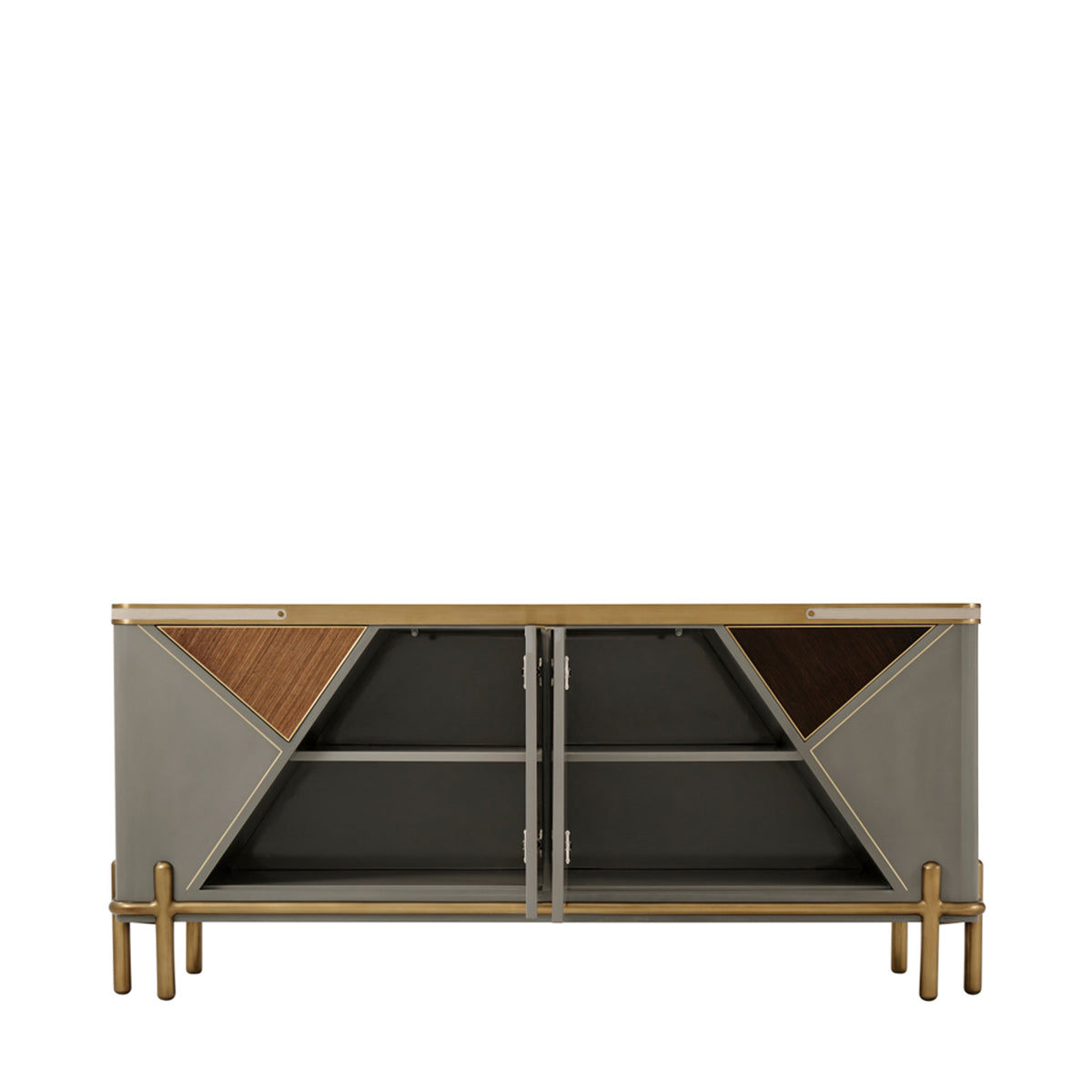 Parquetry Veneered and Lacquered Rounded Edge Rectangular Top. Brass Inlaid Details. Icon Bronze Bound with Leather Inlaid Straps. Two Concealed Drawers and Two Parquetry Cabinet Doors. Proud Icon Bronze Baton Legs with Crossed Details.
