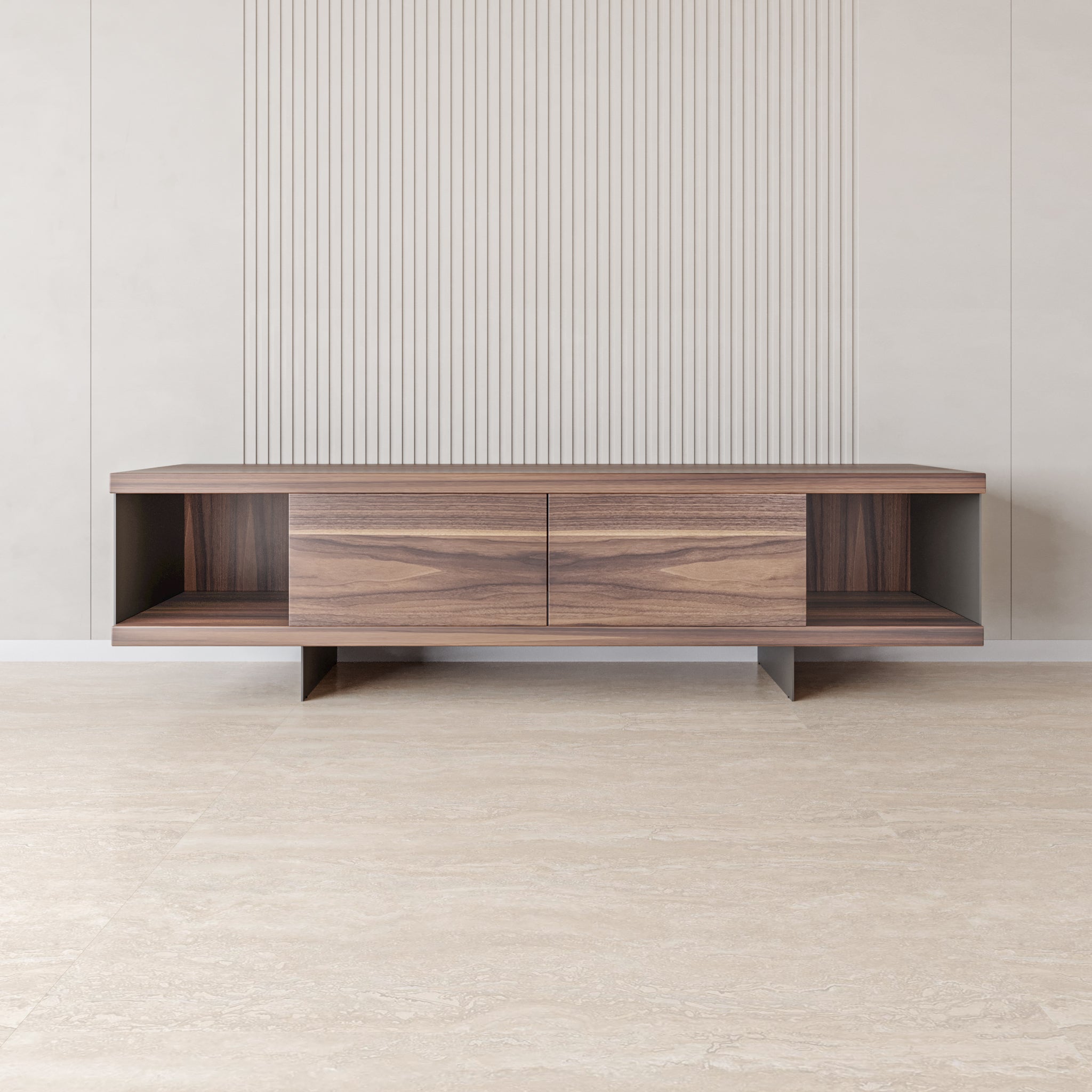 Encased in a Walnut Veneer finish, this beautiful TV cabinet is a sturdy and functional piece that will elevate your contemporary interiors. Standing on a pair of Stainless Steel legs in a Dark Silver finish, this unit is an excellent choice for your media storage needs. It has two doors enclosing a spacious interior flanked by a display compartment on both sides.