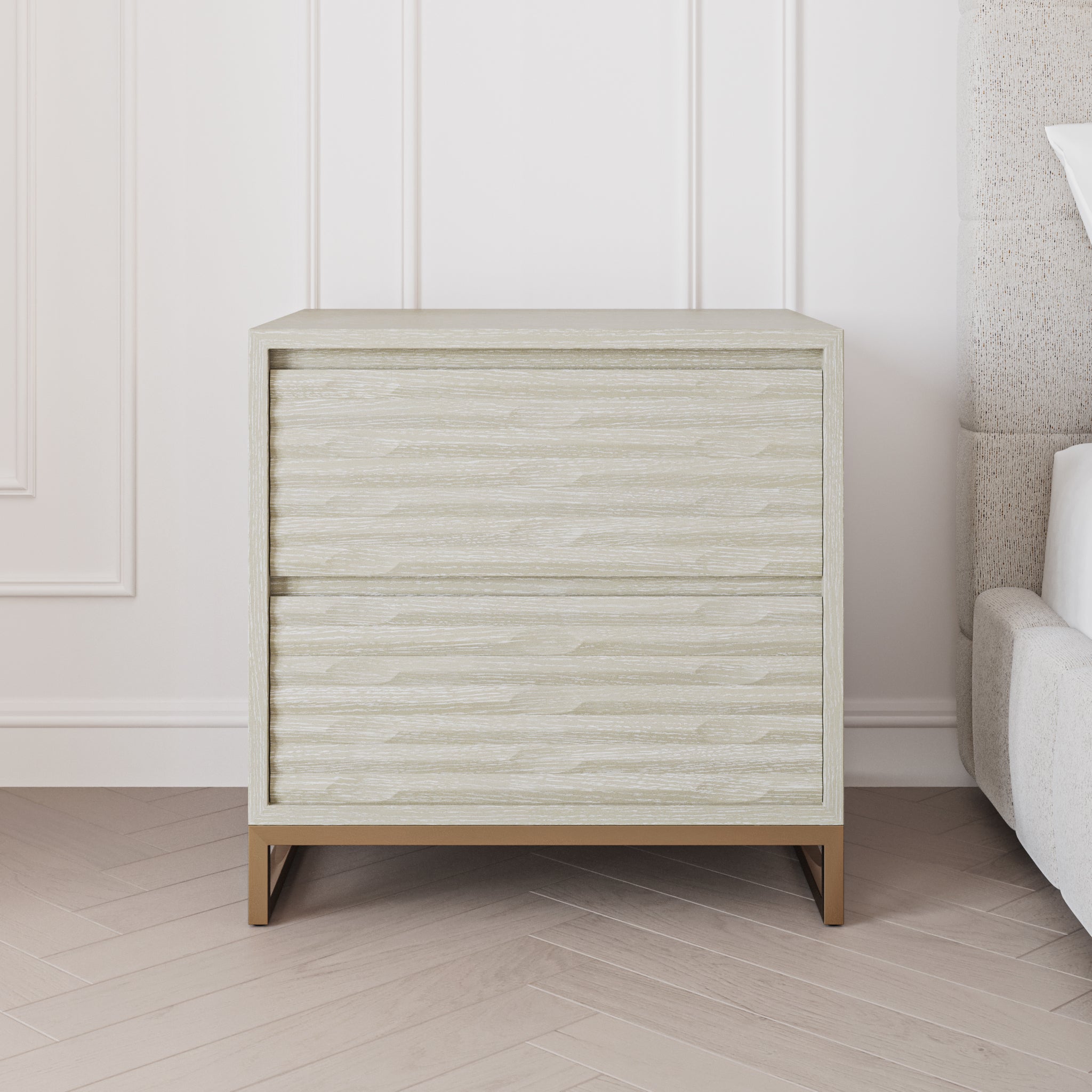 Elevate your bedside with this classic nightstand. A square wooden form in Light Grey Wood finish with a bleaching effect brings a spotless aesthetic. Carrying two drawers to keep your essentials close at hand while flaunting a delicate carving on its front drawers. It is supported by a Stainless Steel base bathed in Brushed Brass for a shimmering touch.