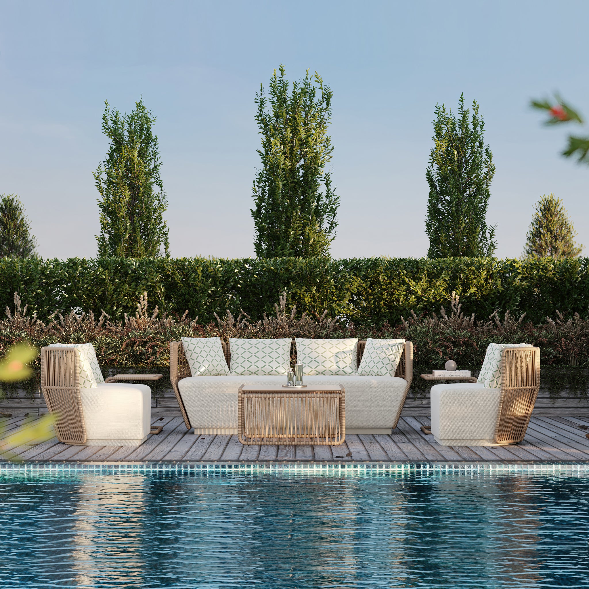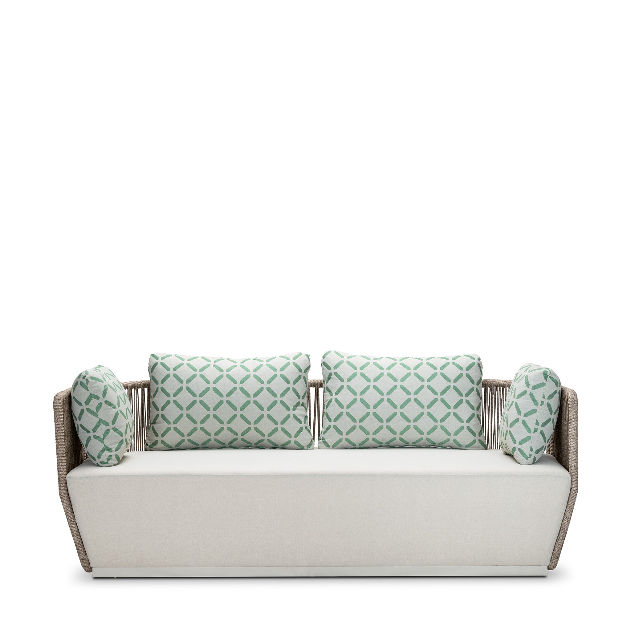 The Iris Three-Seater Sofa will steal your attention with elegant design elements and geometry. The main structure is Aluminium Tube Powder Coated in Beige Sand, adding neutrality. The Olefin Rope is the final touch for a marvelous outdoor sitting experience.