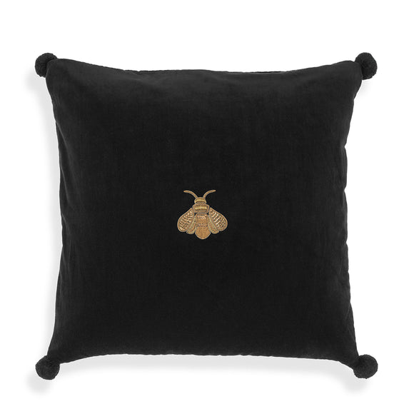 Style your sofa effortlessly with this fashionable pillow. It features a square-shaped form covered in Black Velvet fabric with pompoms on the corners. A hand-embroidered Gold-colored moth in the center adds to the solid composition. Incorporate this piece into your sitting area or the dull corners for a fancy and comfy setting.