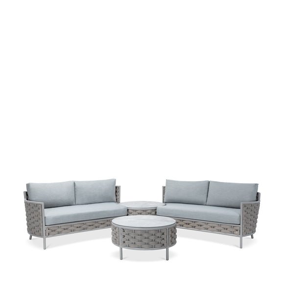 This four-piece composition is ideal for hosting an intimate gathering in your outdoor space on a lovely day. The set contains two round cocktail tables, one left-arm sofa, and one right-arm sofa. Tempered Ceramic-coated glass on tabletops is visually appealing, while the loose seat and back cushions ensure a comfy setting.