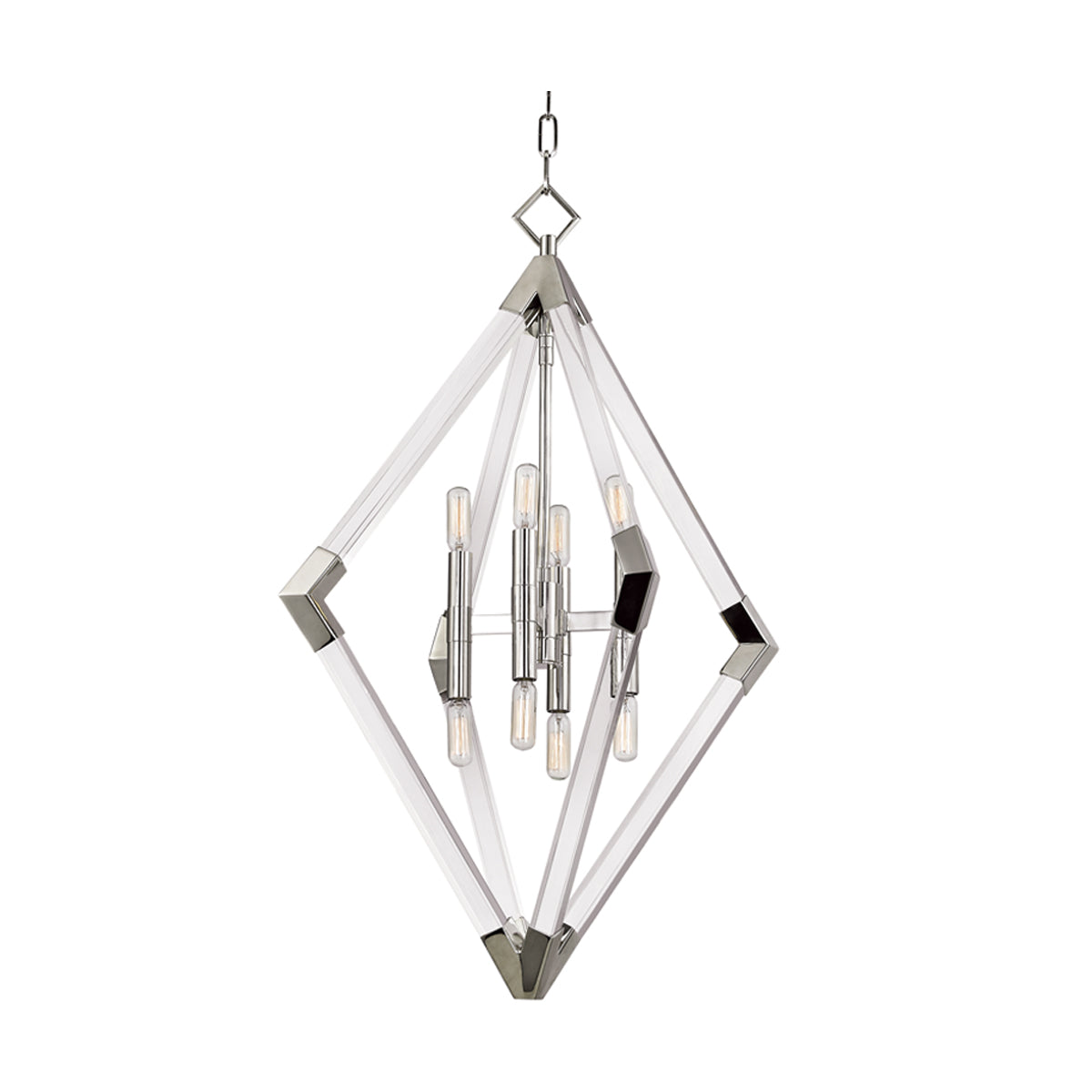 Designed in the Mid-Century style, this luminaire features a loop of diamond-shaped Acrylic frames adorned with metal accents. The Polished Nickel finish perfectly complements the overall aesthetic, while the eight lamps held in place brighten up the space with utmost sophistication. Its symmetrical layout and a balance of textures elevate any space.