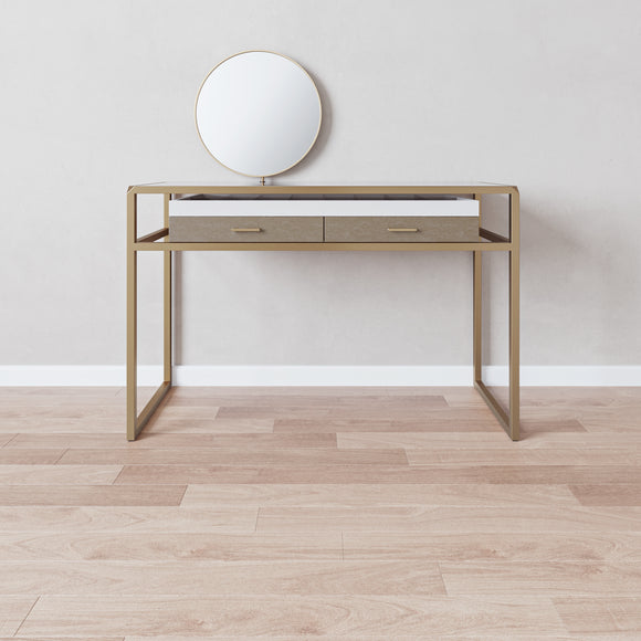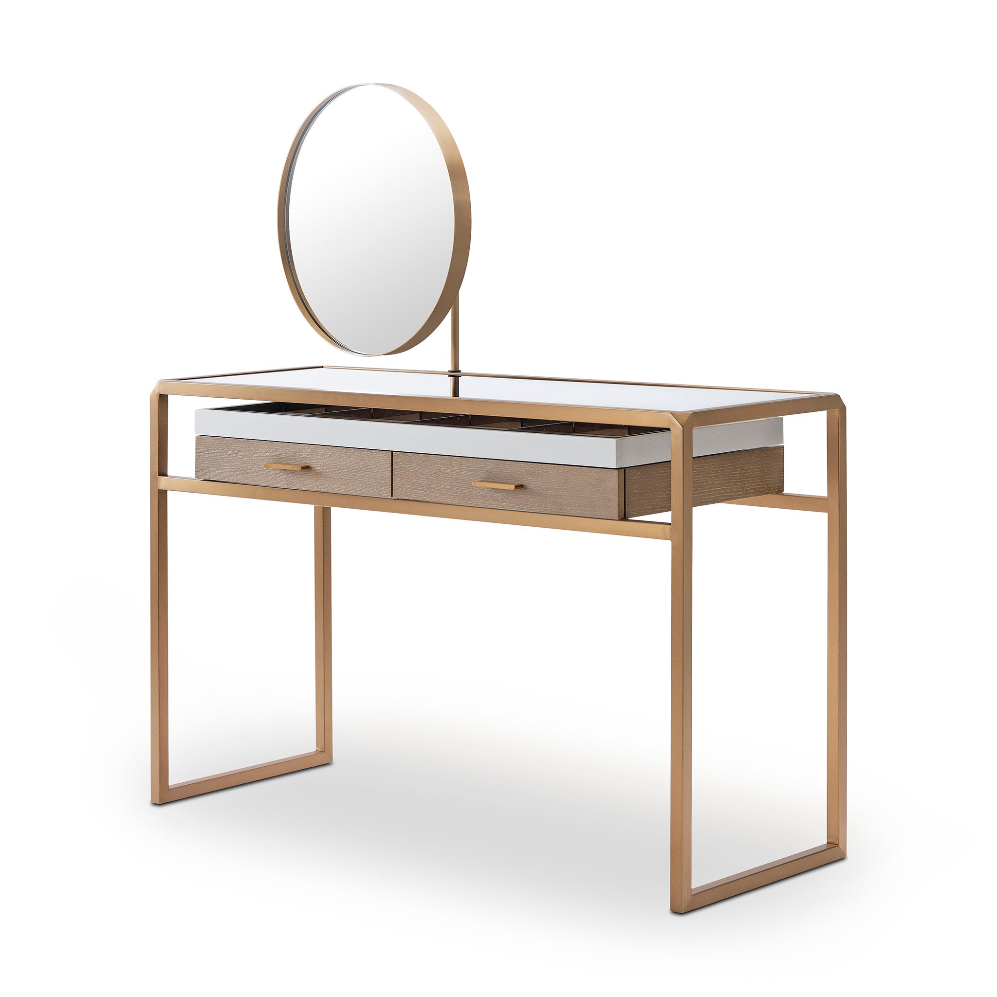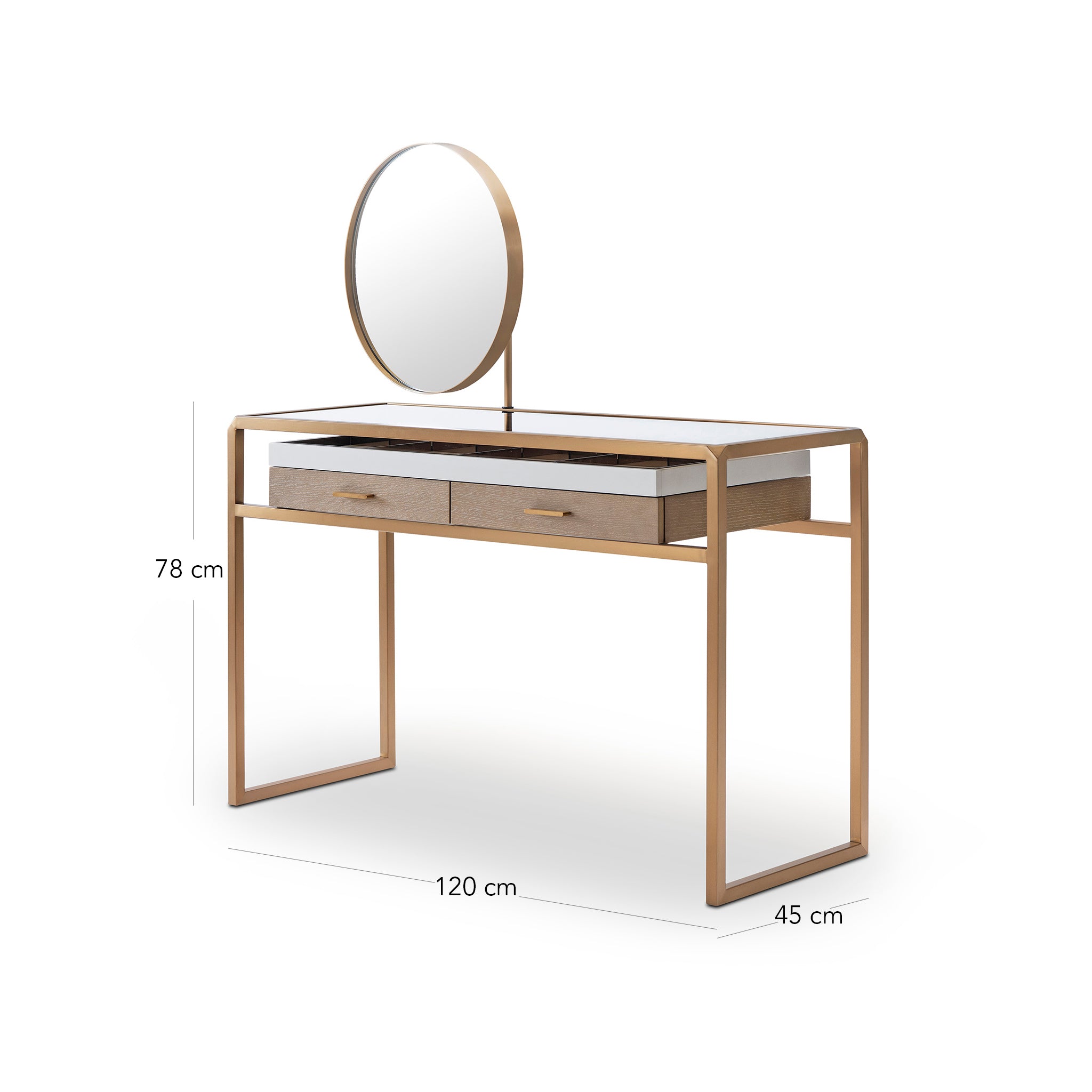 Bring a chic dresser desk into your bedroom's contemporary scheme. It is braced by a metal frame with a Smoked Tempered Glass top for a glazed and clean surface. Keep your essentials hidden beautifully within its two Bleached Greige Oak Wood Veneer drawers accentuated by a Frosted Beige Lacquered finish top. A circular mirror framed in thin metal makes this unit functional and fashionable.