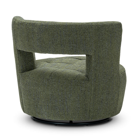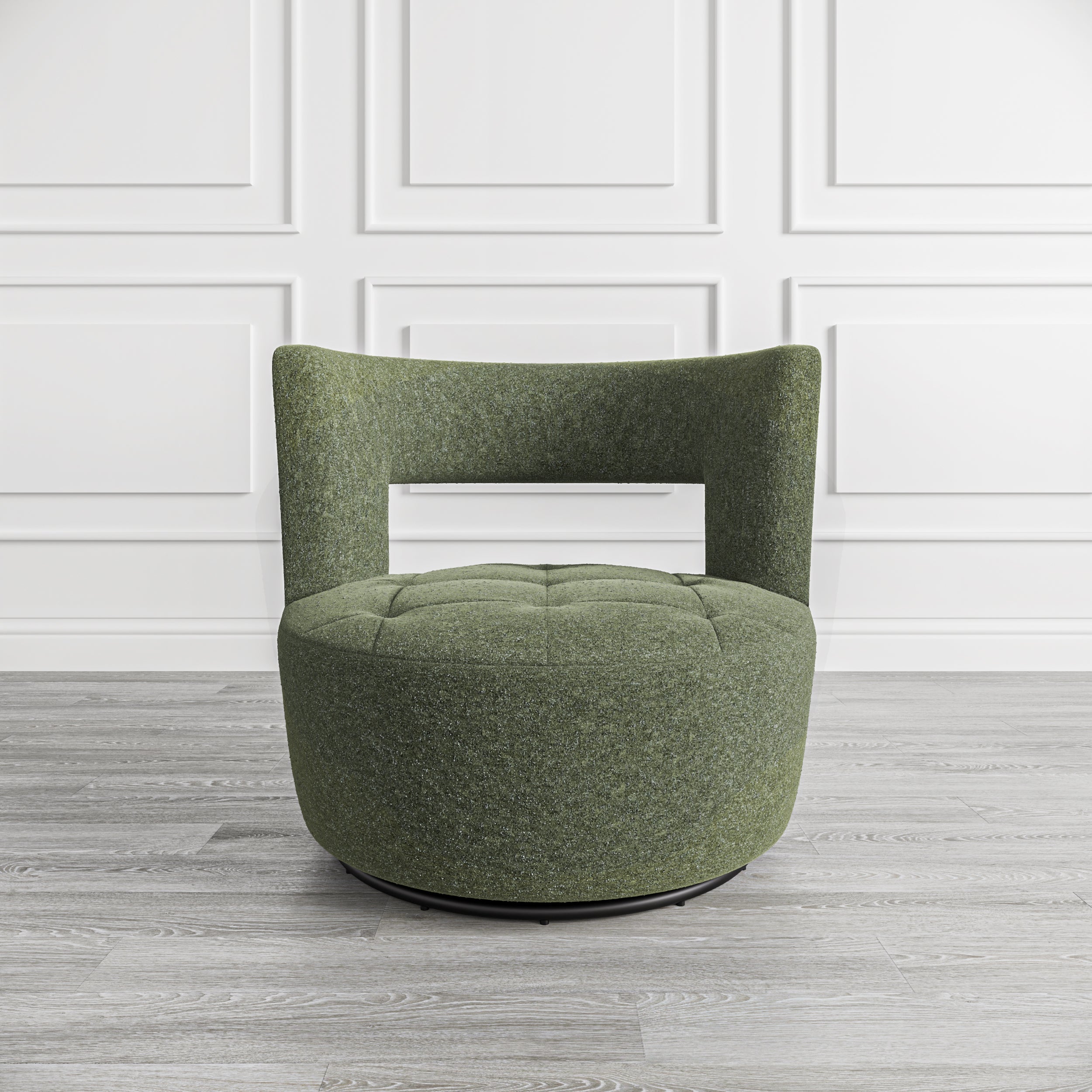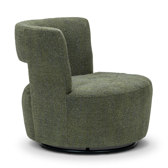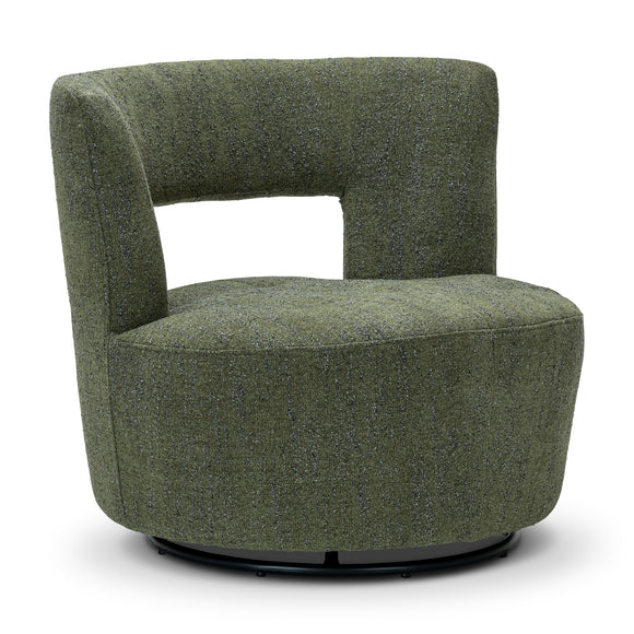 The Monterey Round Armchair flaunts a curved, cut-back structure tailored in Moss Forest Solid fabric to provide a soft and cozy feel. Its swivel metal base with an Ebony finish lets it quickly spin from all directions.