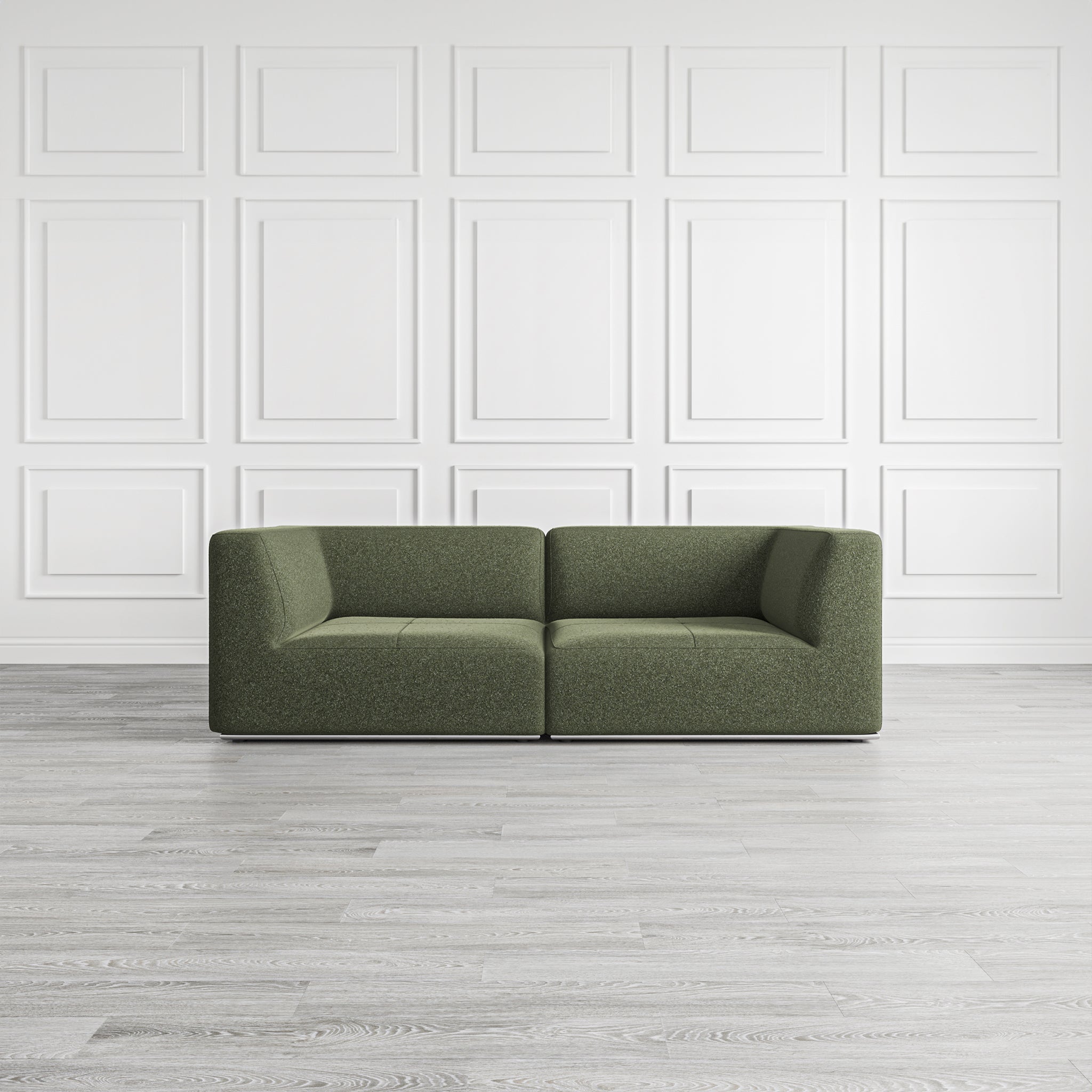 An on-trend 2-seater sofa showcases a Moss Forest Solid fabric upholstery creating a natural look with its subtle square tufting accents. Standing gracefully on its plinth Stainless Steel base is a Polished Nickel finish to elevate its aesthetic. Match it with the Monterey or Montenegro Armchair in the same moss fabric upholstery.