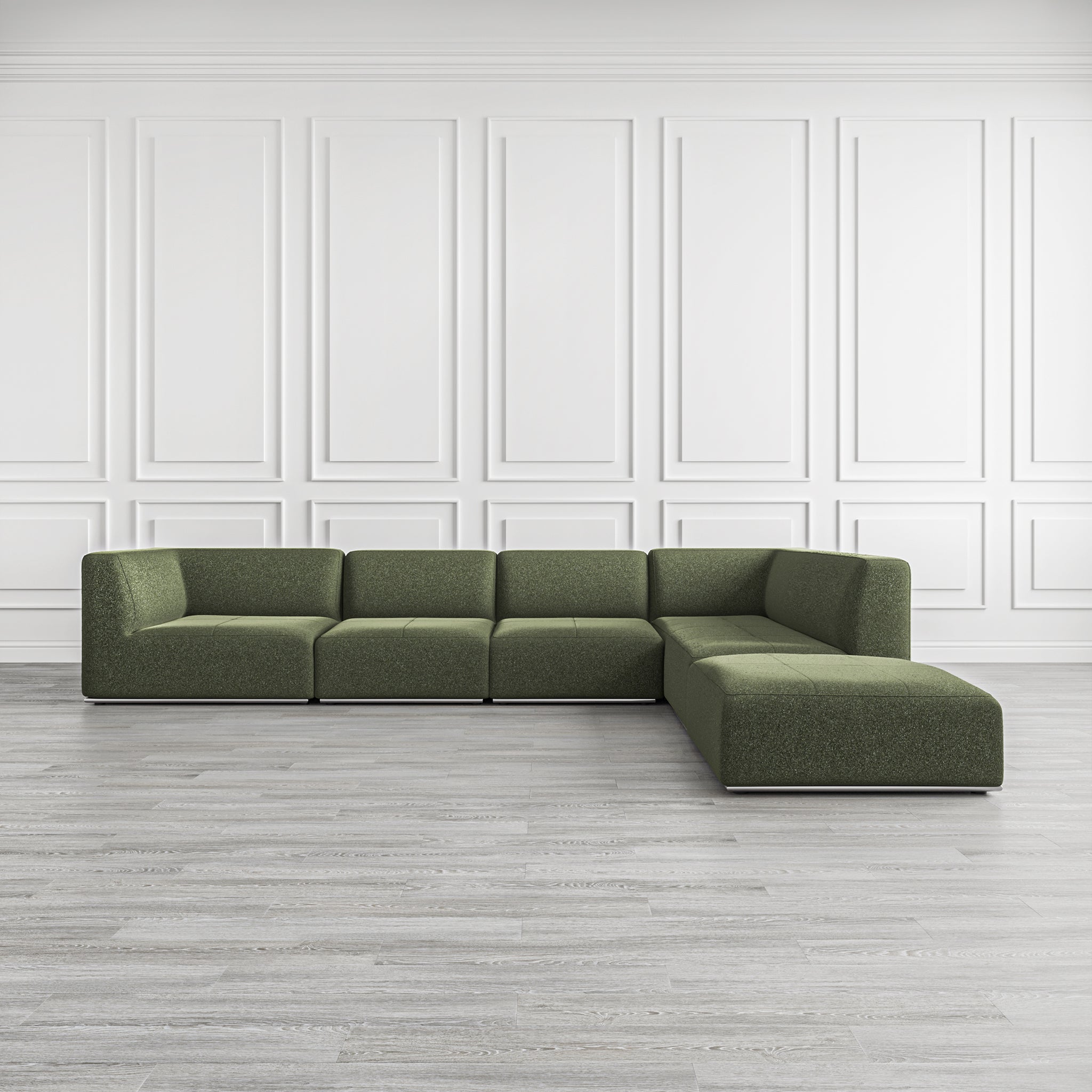 Design that provides a homey look, this right L-shaped sectional sofa in Moss Forest Solid fabric with subtle square tufting detailing provides a welcoming charm. It is supported by a Stainless Steel plinth base in Polished Nickel elevating the look.