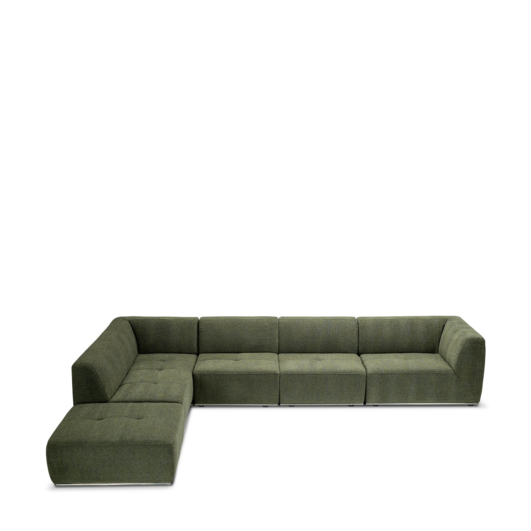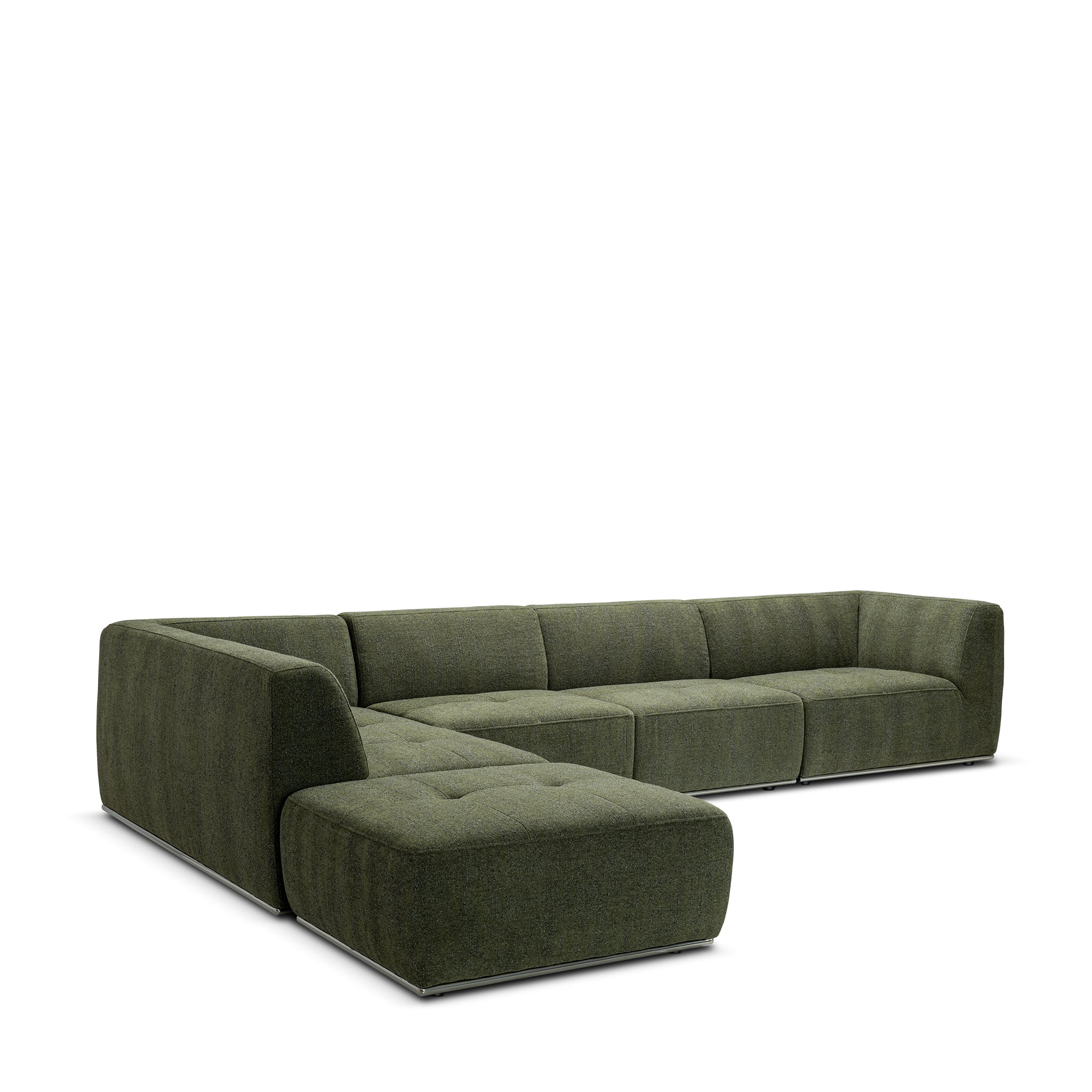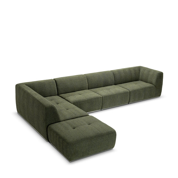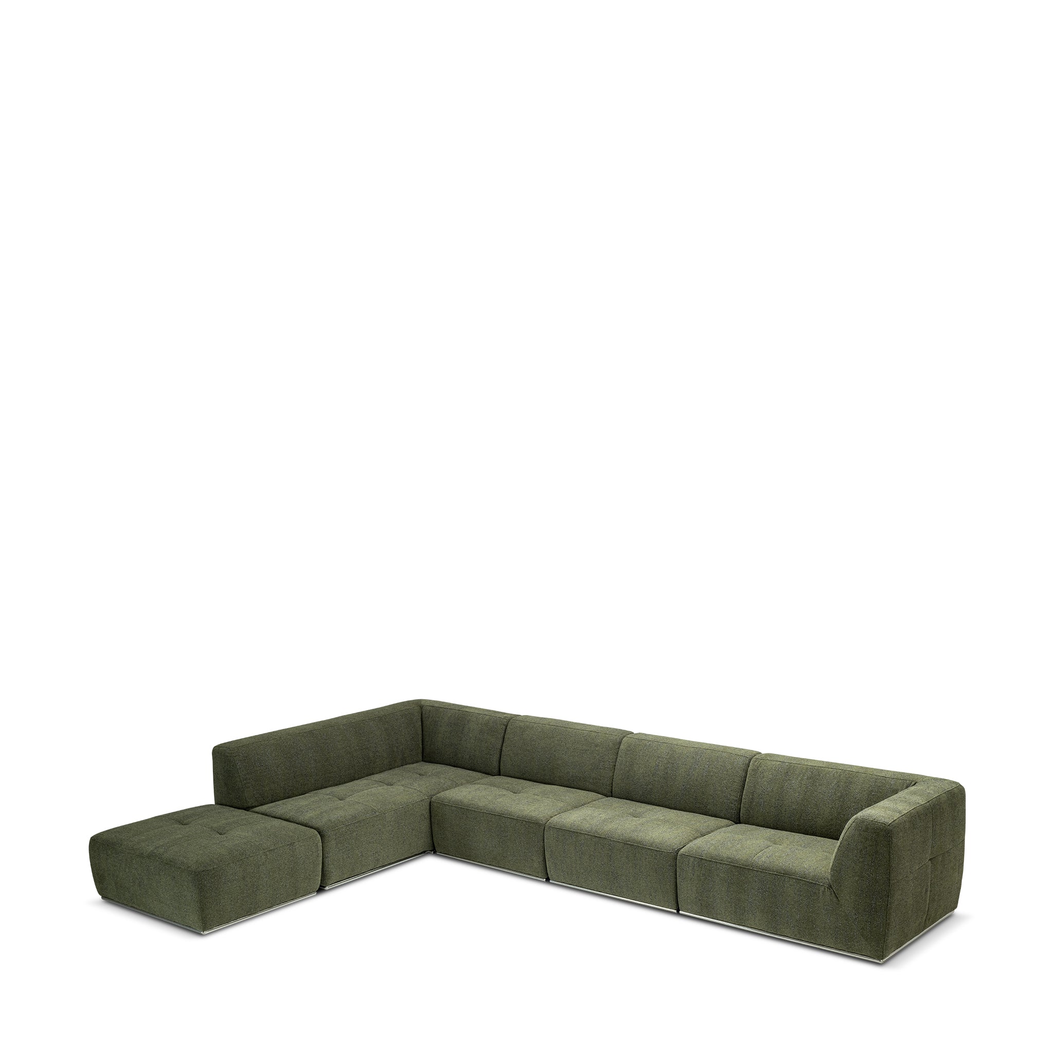 Design that provides a homey look, this left L-shaped sectional sofa in Moss Forest Solid fabric with subtle square tufting detailing provides a welcoming charm. It is supported by a Stainless Steel plinth base in Polished Nickel elevating the look.