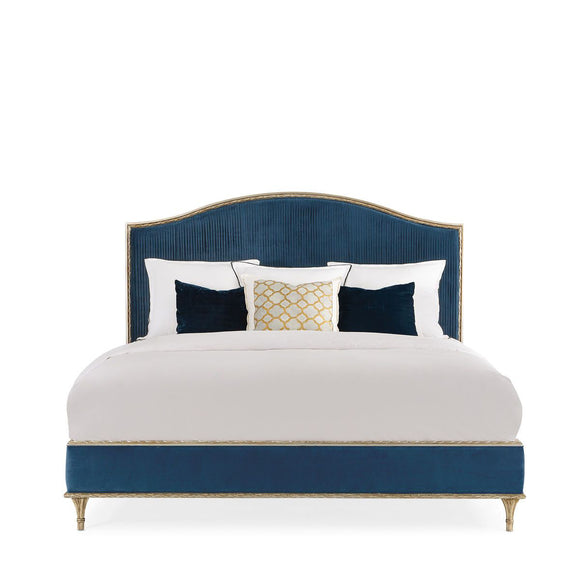 Channel a Mid-century vibe with this bed, featuring a delicate Aluminum carving in Aglow finish for a timeless allure. It is fashioned in rich fabric with vertical sewn pleats on the headboard to create depth and texture. This piece is meant to make a powerful statement in your bedroom.