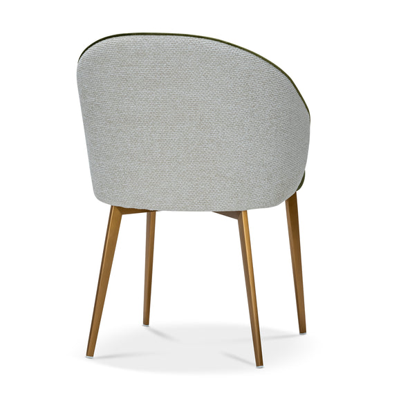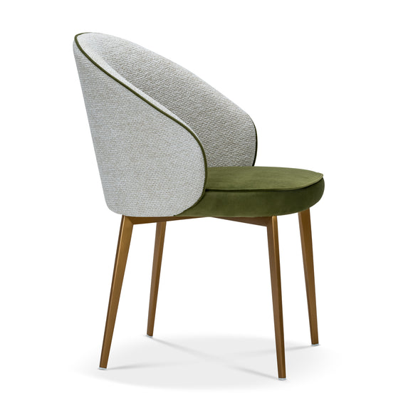 The Polo Verde Dining chair completes an on-trend look with its Green Velvet upholstery. Its curved backrest is covered in Beige Chenille fabric, providing a clean contrast.