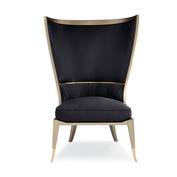 This one-of-a-kind chair draws attention and has a powerful presence. Its slim wood frame with tall winged-back in Golden Shimmer finish provides stylish appeal. Rich Chocolate-Plum Satin upholstery gives supreme comfort. This spectacular design is expertly completed with a Champagne Gold metal bar that matches the metal ferrules on its front legs.