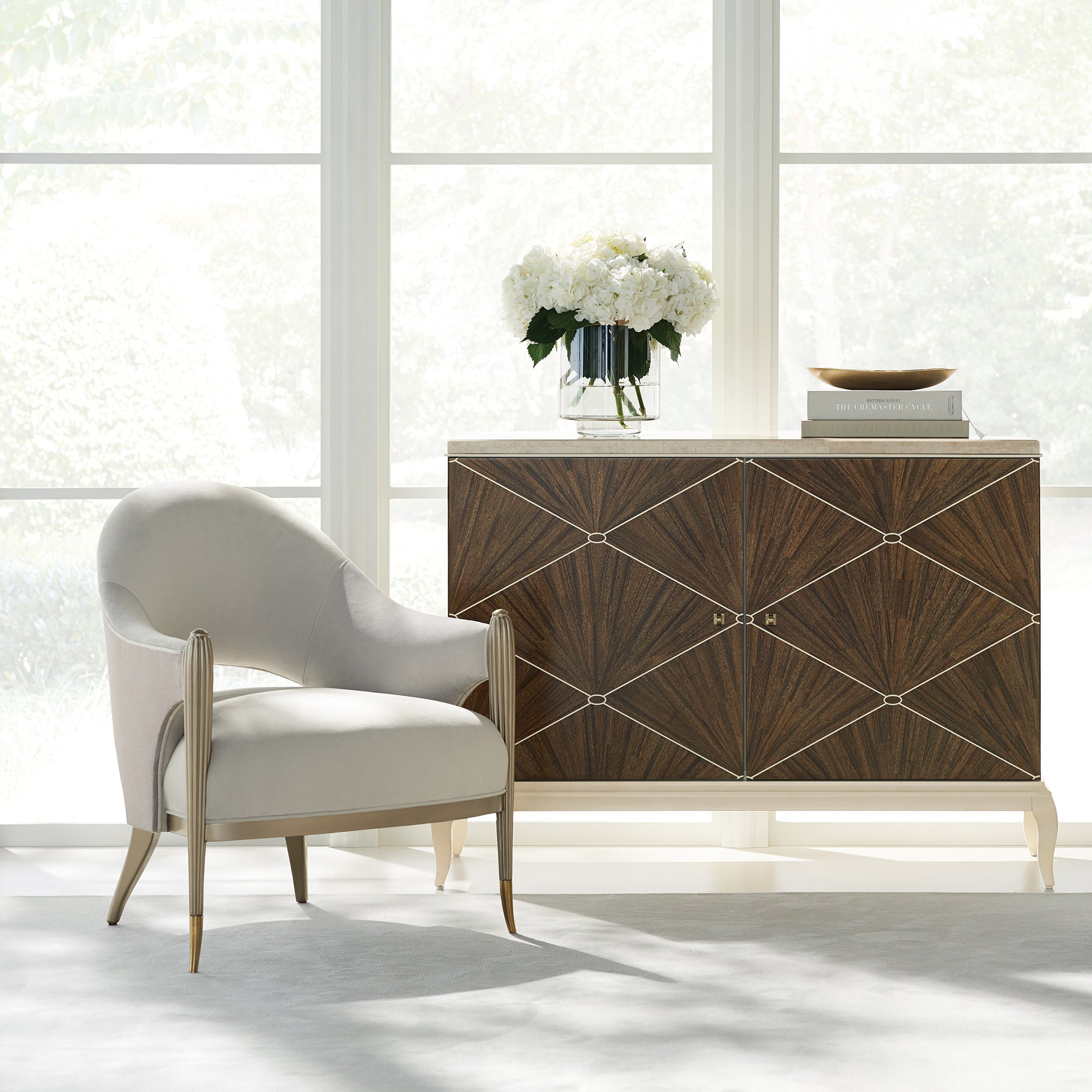 A curved, open back defines its silhouette, and the contrasting upholstery adds another level of sophistication. The exterior seat back is upholstered in a Light Shade of Quartz and covered in a Soft Dove Grey. Fluted arms in Golden Shimmer provide instant glam, and metal ferrules in Champagne Gold complete the look.