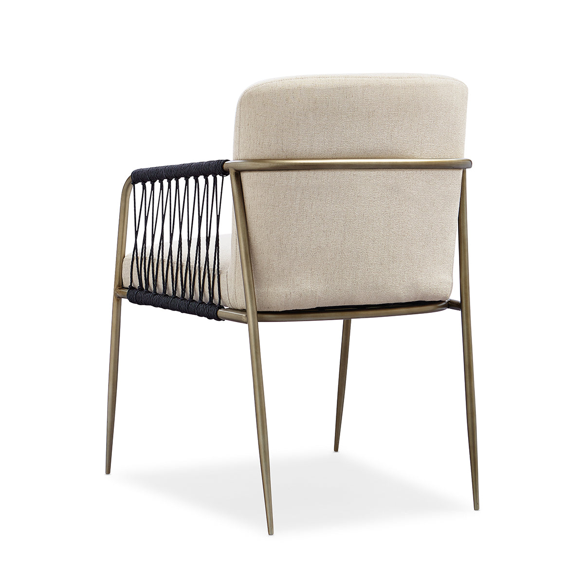 Mixing traditional and modern, this remarkable chair is a visual expression of the best of both worlds. The clean, slender metal frame wears a Bronze Gold Metal finish, while the Black woven cording is designed in a criss-cross pattern alongside each arm. Neutral-tone fabric upholstery offers subtle sophistication and maximum comfort.