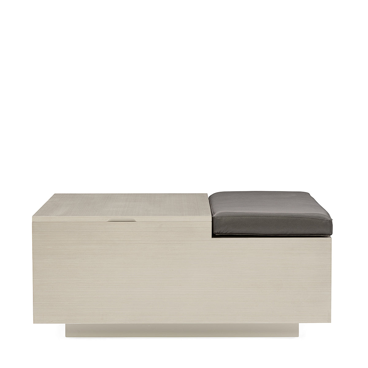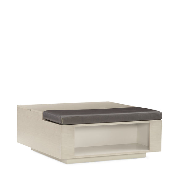 A statement-making addition to any living space, the Repetition Bunching Cocktail Table effortlessly combines form and function. Its geometric silhouette is accentuated by an Ash Taupe finish complemented by a contrasting Mink Gray over its open and interior storage areas. A lift-top makes it the perfect spot for dining or working from home while a loose upholstered seat cushion creates extra seating.