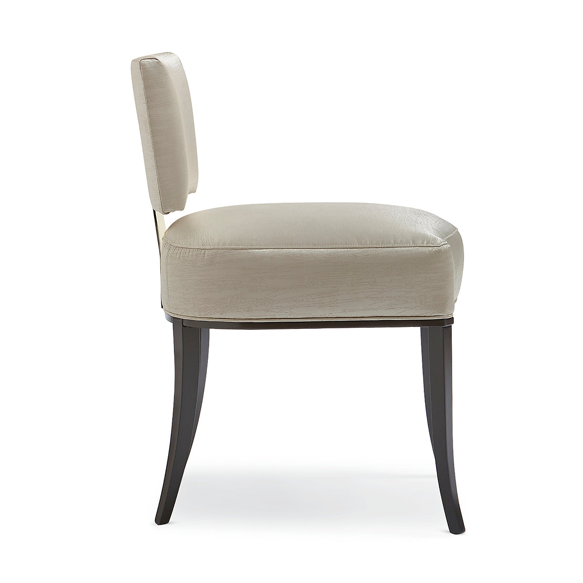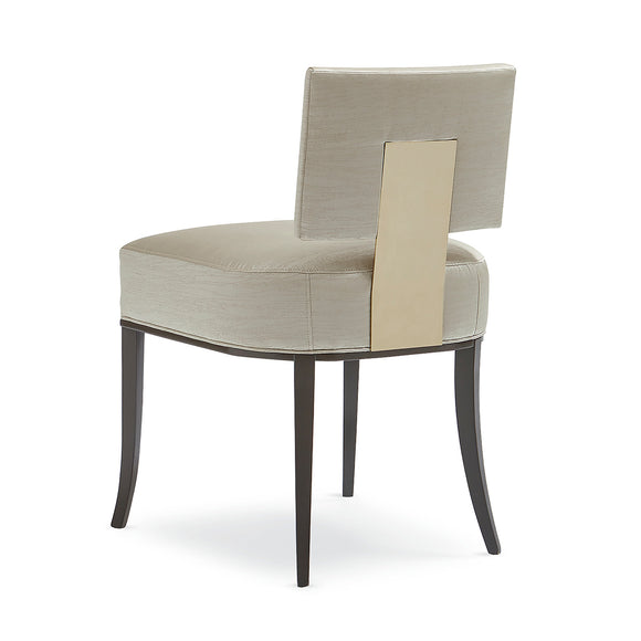 Impress your guests with supreme comfort while they appreciate your tasty meal. It presents an armless composition with saber legs in Seal Skin finish, lending a classy look. Neutral Sateen fabric upholstery provides a glossy and cushy aesthetic. Glam up its design with a metal backplate in Whisper of Gold finish to add a snazzy appeal.