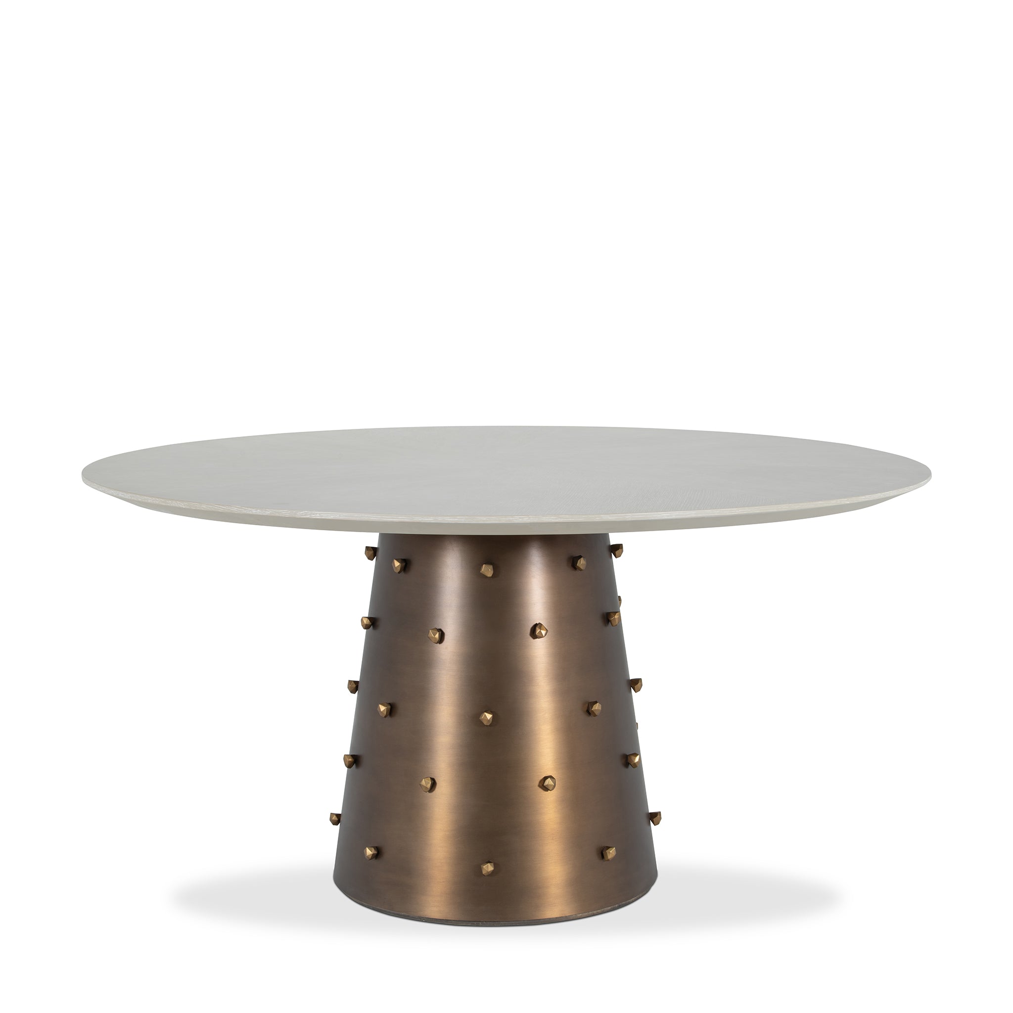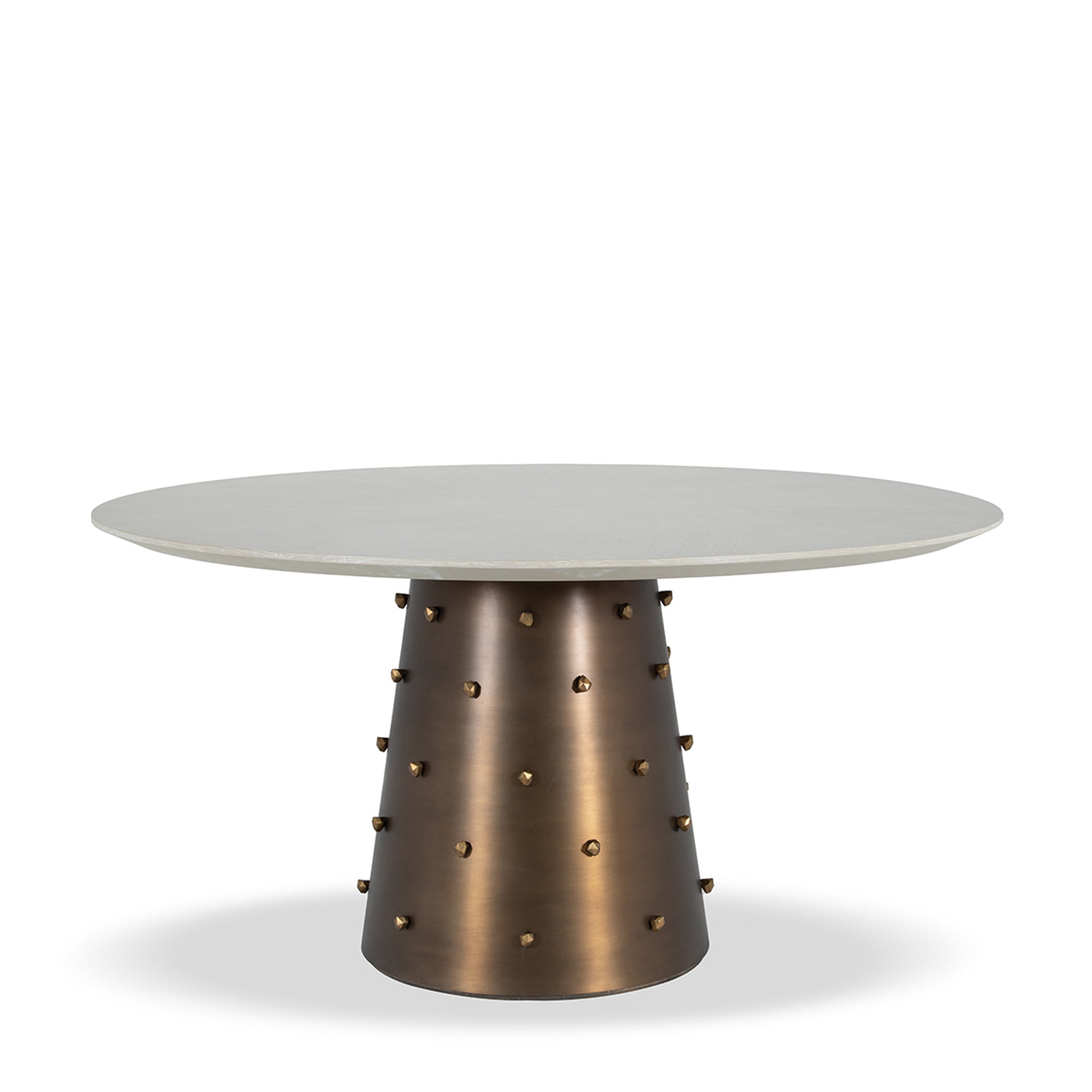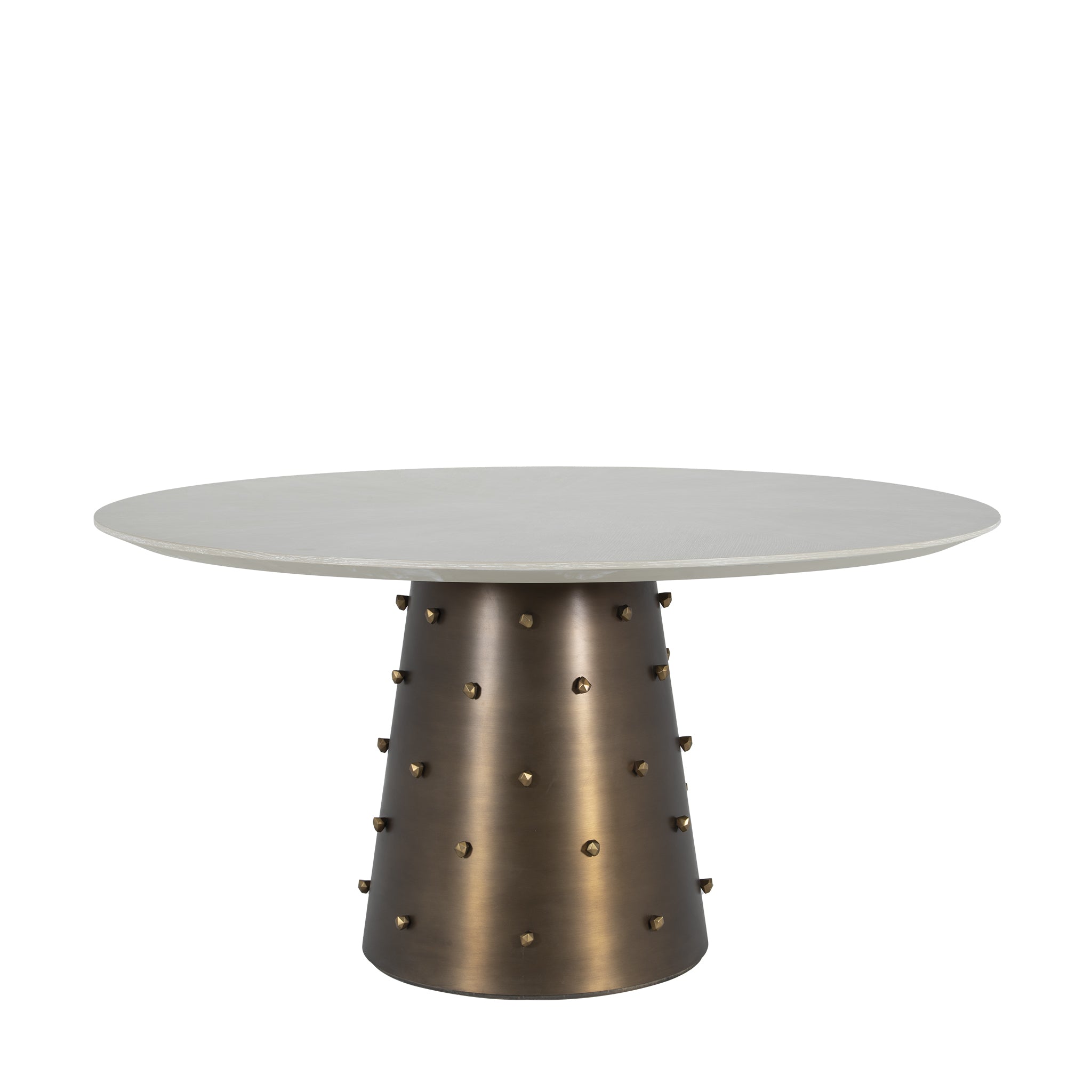 Impeccable and lavish, this dining table parades a show-stopping design that will charm your guests. A round-shaped top in Dark Grey Oak Veneer finish lends a flat and smooth surface. Rest atop a conical Stainless Steel base with an Antique Brass finish accented by rock-shaped knobs all over its foundation for a fresh look.