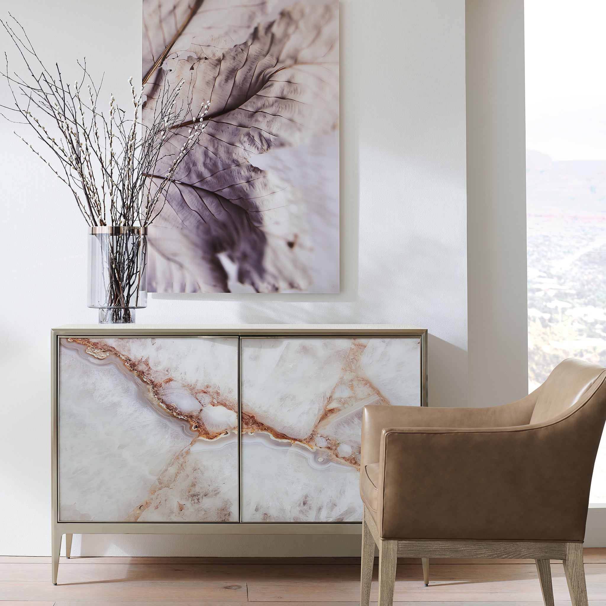 Terracotta and Agate doors feature an Agate painted design in Whites and Greys highlighted by earthy Terracotta colours. With an adjustable shelf and a Crème-painted storage drawer, this piece allows you to arrange in flair. Tapered legs complete the style.
