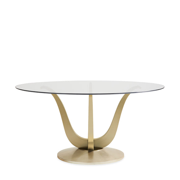 Make your home look lovely by adding this streamlined table. A glass top with a round shape provides a sleek and clean surface. Elevate its aesthetics with a curvy pedestal in Champagned Gold finish that matches its plinth base plated in Golden Blonde Leaf for a glamorous touch. Thanks to its simple yet luxurious design, this piece fits perfectly in any interior scheme.