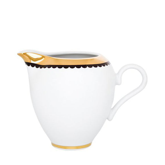Porcel's exquisite Saturn Shanghai Creamer exemplifies luxury with a fine representation. The Saturn rings in black and gold wrap the top edge, offering a timeless, elegant design. Innovation in the shape makes it a one-of-a-kind piece at the table.